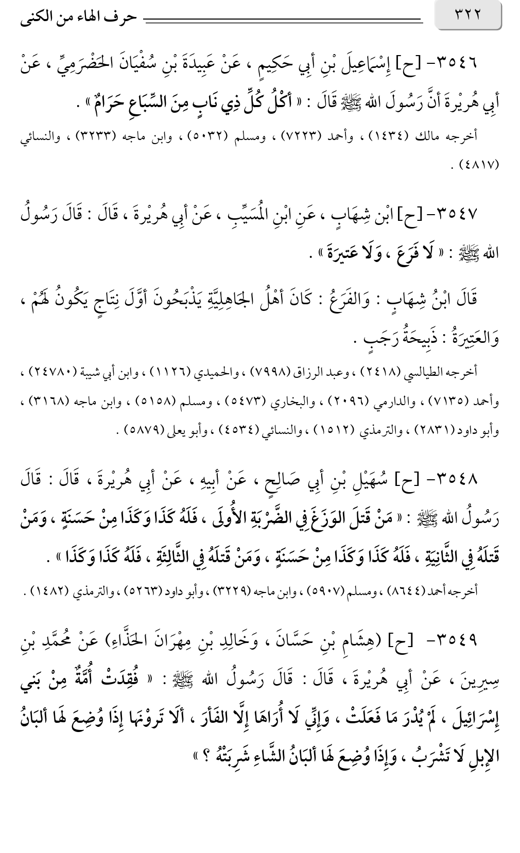 ٣٥٤٦ - [ح] إِسْمَاعِيلَ بْنِ أبِي حَكِيمٍ، عَنْ عَبِيدَةَ بْنِ سُفْيَانَ الحَضْرَمِيِّ، عَنْ أبِي هُريْرةَ أنَّ رَسُولَ الله صلى الله عليه وسلم قَالَ: «أكْلُ كُلِّ ذِي نَابٍ مِنَ السِّبَاعِ حَرَامٌ».