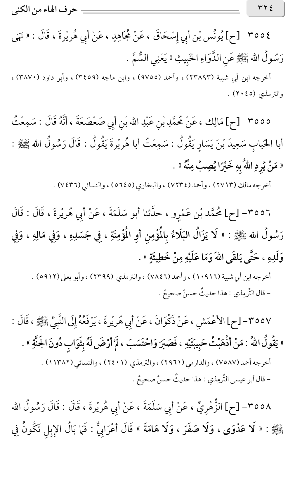 ٣٥٥٦ - [ح] مُحمَّد بْن عَمْرٍو، حدَّثنا أبو سَلَمَةَ، عَنْ أبِي هُريْرةَ، قَالَ: قَالَ رَسُولُ الله صلى الله عليه وسلم: «لَا يَزَالُ البَلَاءُ بِالمُؤْمِنِ أوِ المُؤْمِنَةِ، فِي جَسَدِهِ، وَفِي مَالِهِ، وَفِي وَلَدِهِ، حَتَّى يَلقَى اللهَ وَمَا عَلَيْهِ مِنْ خَطِيئَةٍ».