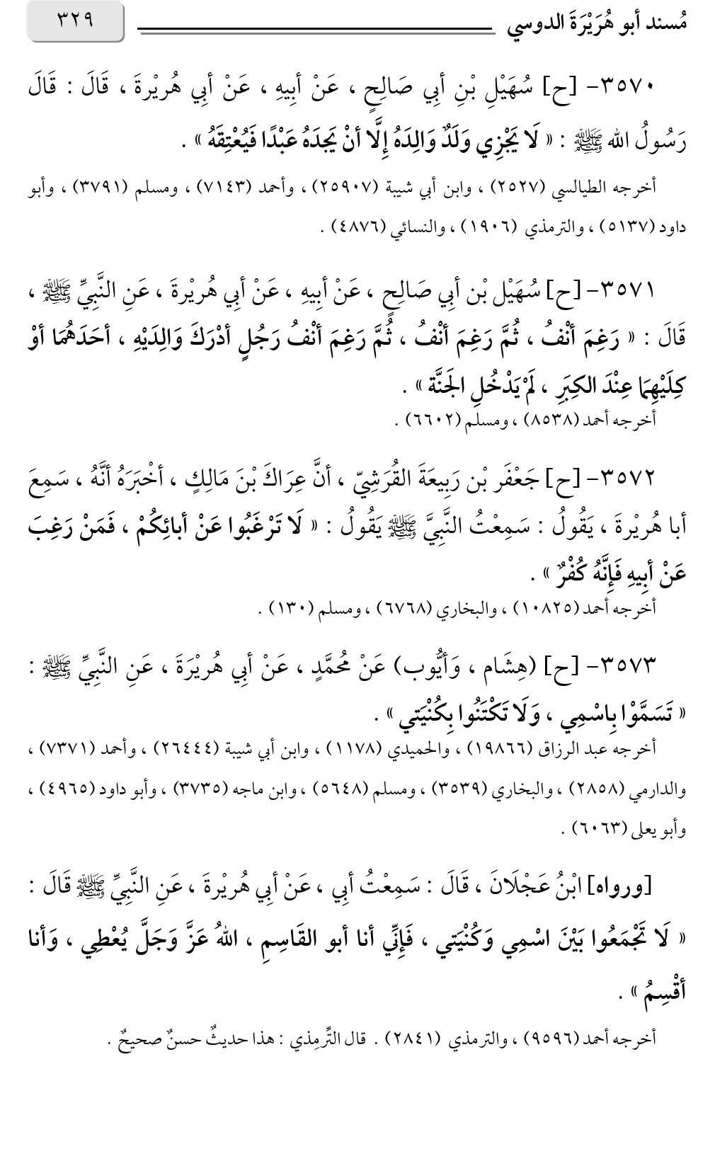 ٣٥٧٢ - [ح] جَعْفَر بْن رَبِيعَةَ القُرَشِيّ، أنَّ عِرَاكَ بْنَ مَالِكٍ، أخْبَرَهُ أنَّهُ، سَمِعَ أبا هُريْرةَ، يَقُولُ: سَمِعْتُ النَّبِيَّ صلى الله عليه وسلم يَقُولُ: «لَا تَرْغَبُوا عَنْ أبائِكُمْ، فَمَنْ رَغِبَ عَنْ أبِيهِ فَإِنَّهُ كُفْرٌ».