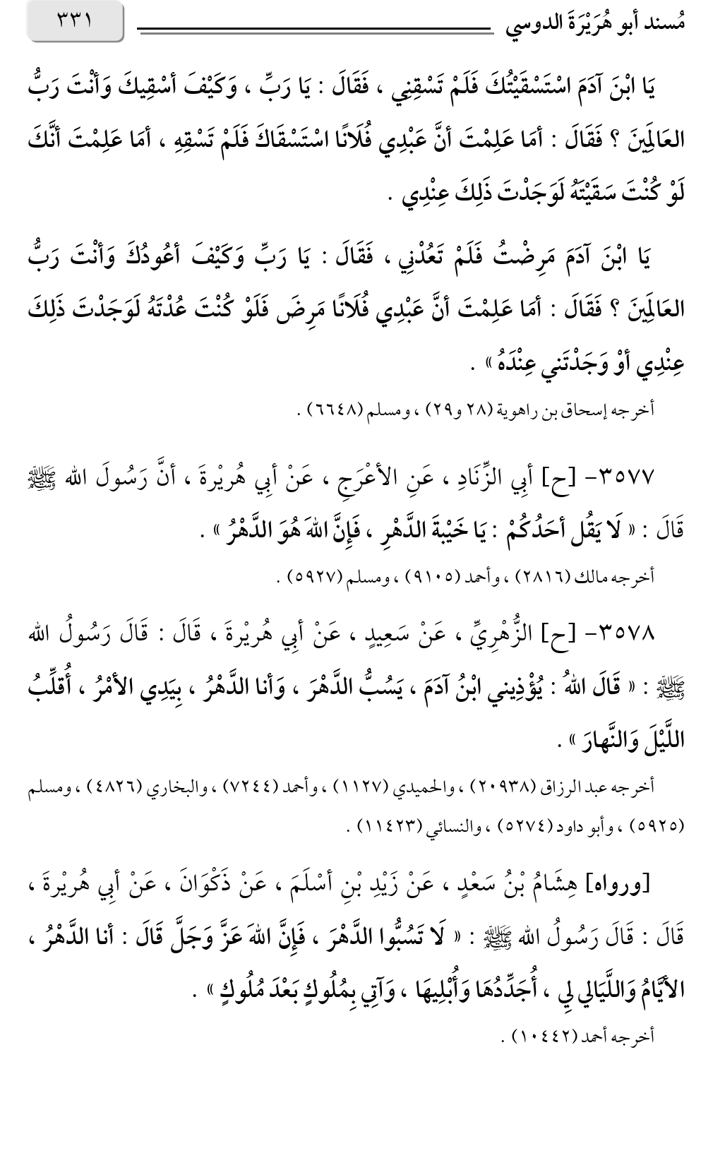 [ورواه] هِشَامُ بْنُ سَعْدٍ، عَنْ زَيْدِ بْنِ أسْلَمَ، عَنْ ذَكْوَانَ، عَنْ أبِي هُريْرةَ، قَالَ: قَالَ رَسُولُ الله صلى الله عليه وسلم: «لَا تَسُبُّوا الدَّهْرَ، فَإِنَّ اللهَ عَزَّ وَجَلَّ قَالَ: أنا الدَّهْرُ، الأيَّامُ وَاللَّيَالي لِي، أُجَدِّدُهَا وَأُبْلِيهَا، وَآتِي بِمُلُوكٍ بَعْدَ مُلُوكٍ».