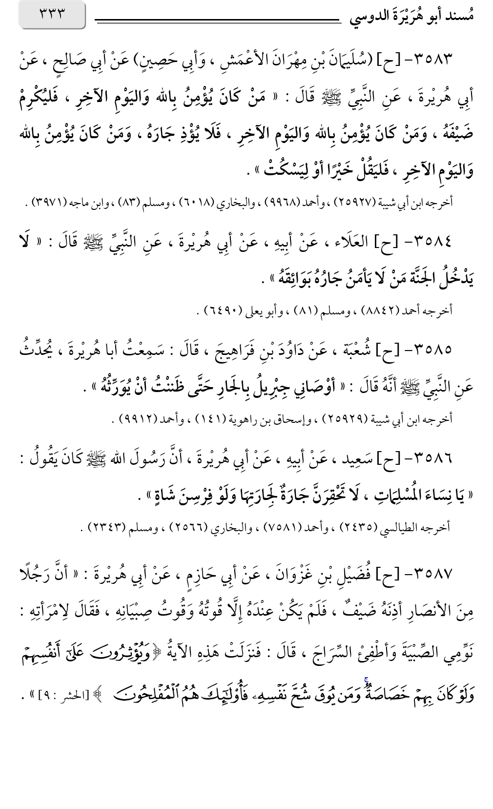 ٣٥٨٣ - [ح] (سُلَيمَانَ بْنِ مِهْرَانَ الأعْمَشِ، وَأبِي حَصِينٍ) عَنْ أبِي صَالِحٍ، عَنْ أبِي هُريْرةَ، عَنِ النَّبِيِّ صلى الله عليه وسلم قَالَ: «مَنْ كَانَ يُؤْمِنُ بِالله وَاليَوْمِ الآخِرِ، فَليُكْرِمْ ضَيْفَهُ، وَمَنْ كَانَ يُؤْمِنُ بِالله وَاليَوْمِ الآخِرِ، فَلَا يُؤْذِ جَارَهُ، وَمَنْ كَانَ يُؤْمِنُ بِالله وَاليَوْمِ الآخِرِ، فَليَقُلْ خَيْرًا أوْ لِيَسْكُتْ».