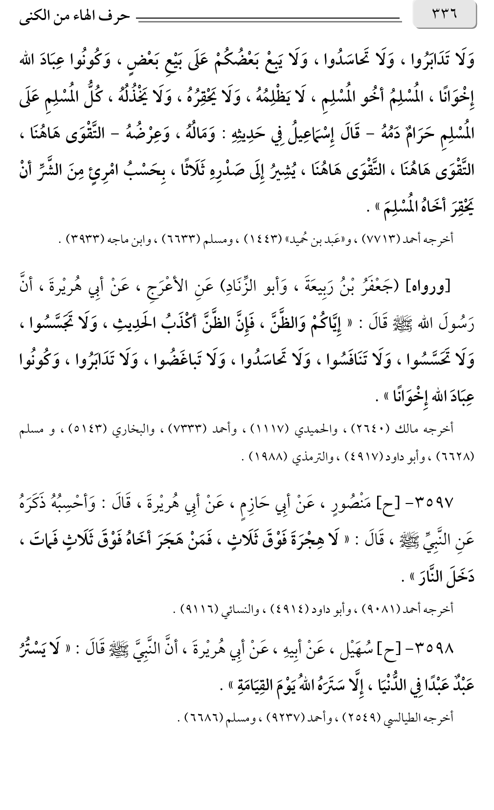 وَلَا تَدَابَرُوا، وَلَا تَحاسَدُوا، وَلَا يَبِعْ بَعْضُكُمْ عَلَى بَيْعِ بَعْضٍ، وَكُونُوا عِبَادَ الله إِخْوَانًا، المُسْلِمُ أخُو المُسْلِمِ، لَا يَظْلِمُهُ، وَلَا يَحْقِرُهُ، وَلَا يَخْذُلُهُ، كُلُّ المُسْلِمِ عَلَى المُسْلِمِ حَرَامٌ دَمُهُ - قَالَ إِسْمَاعِيلُ فِي حَدِيثِهِ: وَمَالُهُ، وَعِرْضُهُ - التَّقْوَى هَاهُنَا، التَّقْوَى هَاهُنَا، التَّقْوَى هَاهُنَا، يُشِيرُ إِلَى صَدْرِهِ ثَلَاثًا، بِحَسْبُ امْرِئٍ مِنَ الشَّرِّ أنْ يَحْقِرَ أخَاهُ المُسْلِمَ».