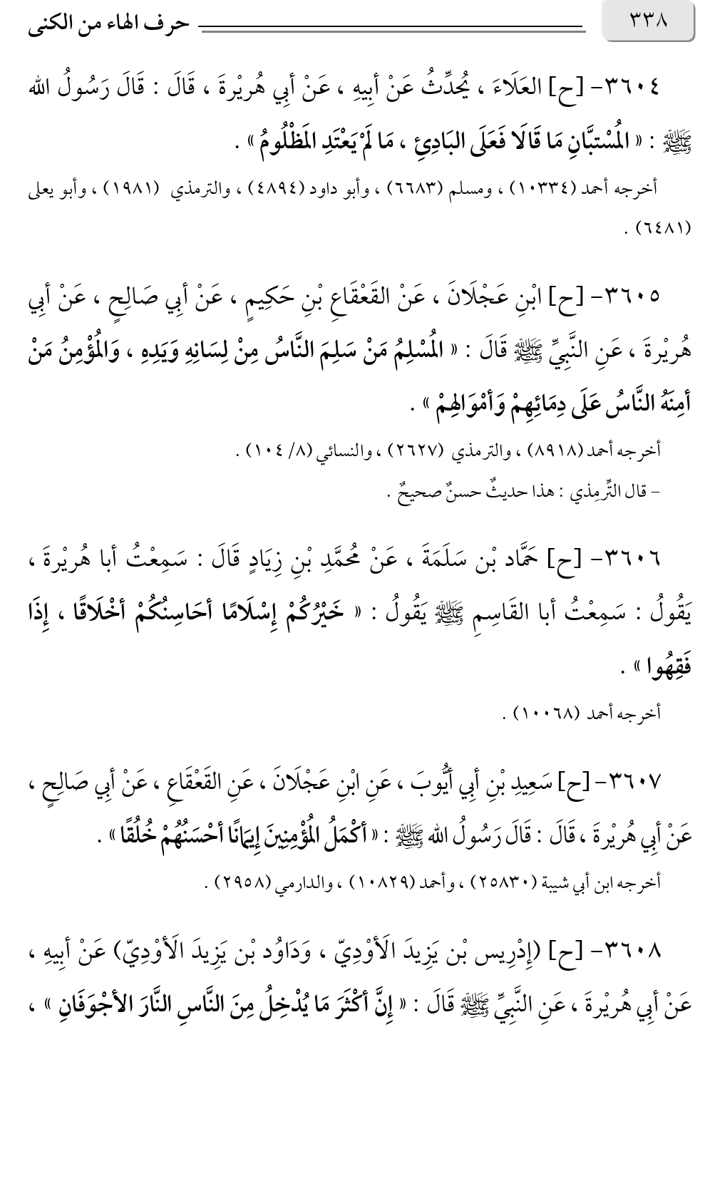 ٣٦٠٧ - [ح] سَعِيدِ بْنِ أبِي أيُّوبَ، عَنِ ابْنِ عَجْلَانَ، عَنِ القَعْقَاعِ، عَنْ أبِي صَالِحٍ، عَنْ أبِي هُريْرةَ، قَالَ: قَالَ رَسُولُ الله صلى الله عليه وسلم: «أكْمَلُ المُؤْمِنِينَ إِيمَانًا أحْسَنُهُمْ خُلُقًا».