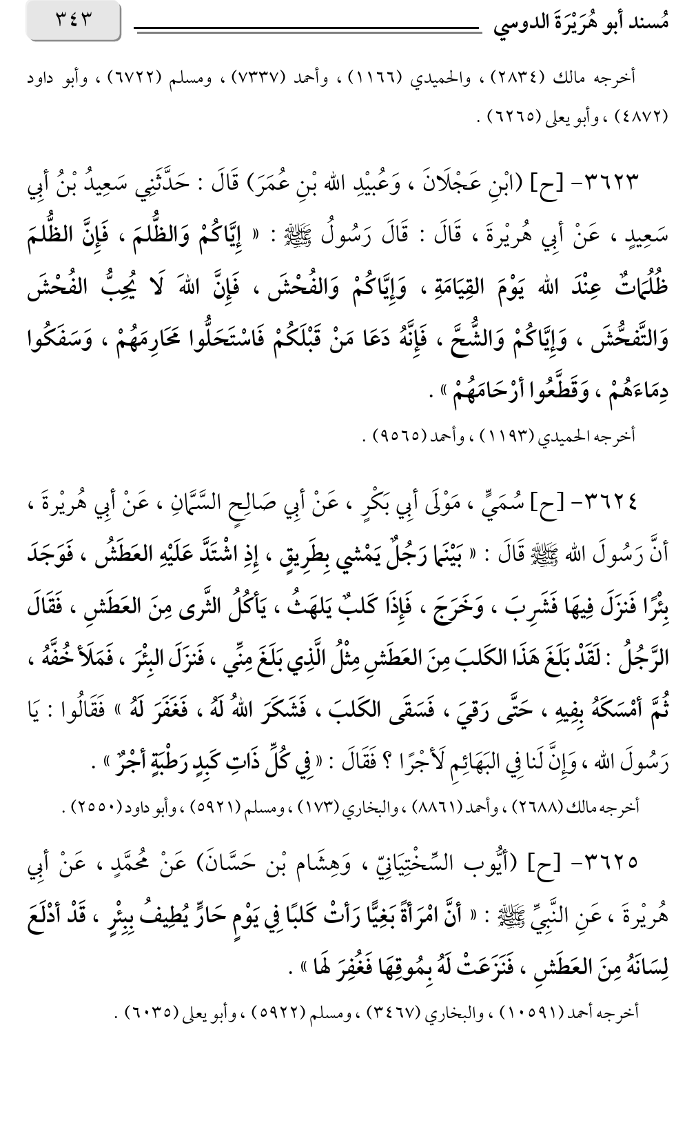 ٣٦٢٣ - [ح] (ابْنِ عَجْلَانَ، وَعُبيْدِ الله بْنِ عُمَرَ) قَالَ: حَدَّثَنِي سَعِيدُ بْنُ أبِي سَعِيدٍ، عَنْ أبِي هُريْرةَ، قَالَ: قَالَ رَسُولُ صلى الله عليه وسلم: «إِيَّاكُمْ وَالظُّلمَ، فَإِنَّ الظُّلمَ ظُلُمَاتٌ عِنْدَ الله يَوْمَ القِيَامَةِ، وَإِيَّاكُمْ وَالفُحْشَ، فَإِنَّ اللهَ لَا يُحِبُّ الفُحْشَ وَالتَّفحُّشَ، وَإِيَّاكُمْ وَالشُّحَّ، فَإِنَّهُ دَعَا مَنْ قَبْلَكُمْ فَاسْتَحَلُّوا مَحَارِمَهُمْ، وَسَفَكُوا دِمَاءَهُمْ، وَقَطَّعُوا أرْحَامَهُمْ».