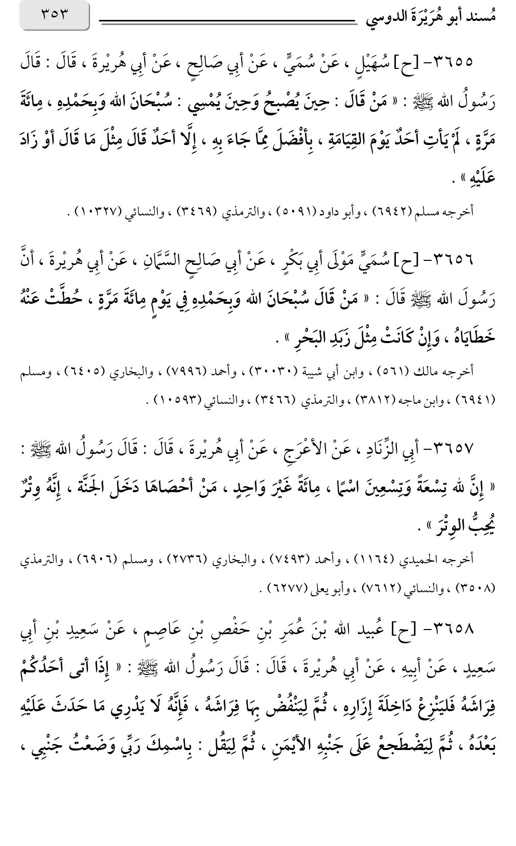 ٣٦٥٥ - [ح] سُهَيْلٍ، عَنْ سُمَيٍّ، عَنْ أبِي صَالِحٍ، عَنْ أبِي هُريْرةَ، قَالَ: قَالَ رَسُولُ الله صلى الله عليه وسلم: «مَنْ قَالَ: حِينَ يُصْبحُ وَحِينَ يُمْسِي: سُبْحَانَ الله وَبِحَمْدِهِ، مِائَةَ مَرَّةٍ، لَمْ يَأتِ أحَدٌ يَوْمَ القِيَامَةِ، بِأفْضَلَ مِمَّا جَاءَ بِهِ، إِلَّا أحَدٌ قَالَ مِثْلَ مَا قَالَ أوْ زَادَ عَلَيْهِ».