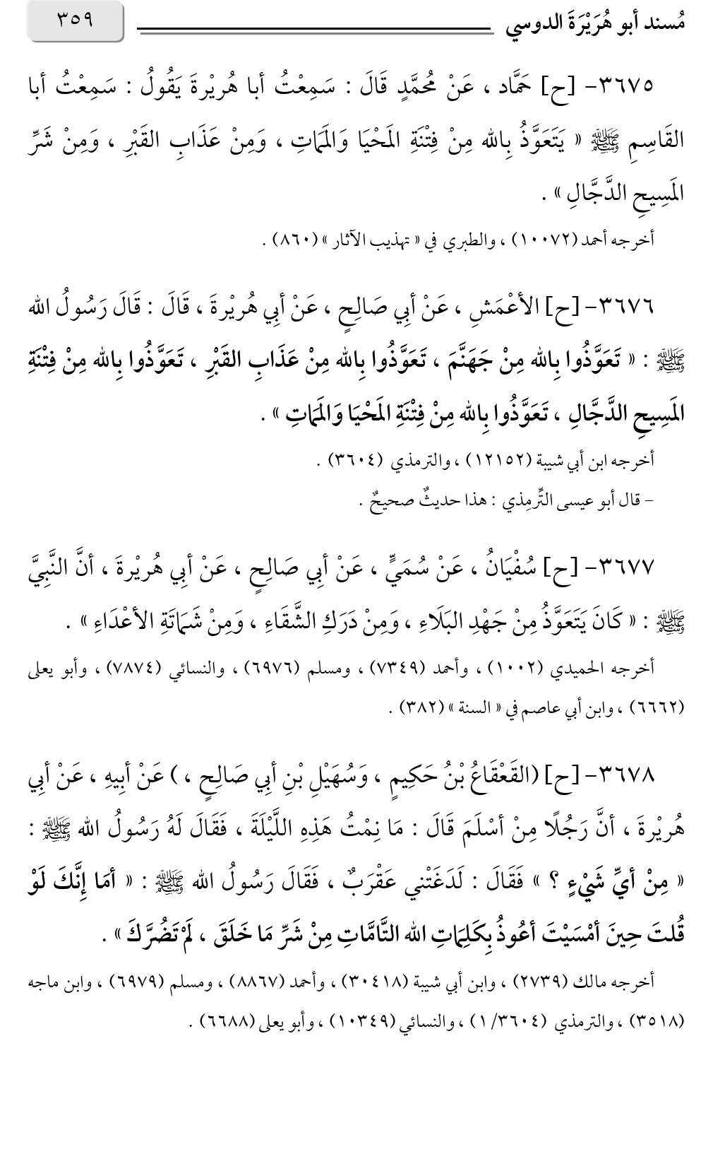 ٣٦٧٥ - [ح] حَمَّاد، عَنْ مُحمَّدٍ قَالَ: سَمِعْتُ أبا هُريْرةَ يَقُولُ: سَمِعْتُ أبا القَاسِمِ صلى الله عليه وسلم «يَتَعَوَّذُ بِالله مِنْ فِتْنَةِ المَحْيَا وَالمَمَاتِ، وَمِنْ عَذَابِ القَبْرِ، وَمِنْ شَرِّ المَسِيحِ الدَّجَّالِ».