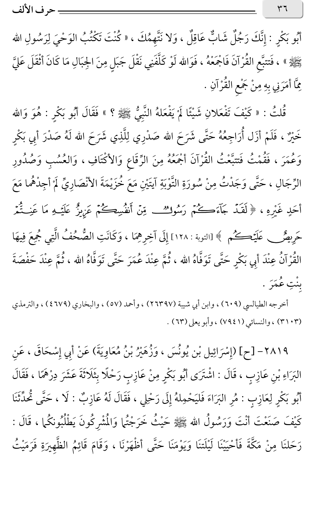 قُلتُ: «كَيْفَ تَفْعَلانِ شَيْئًا لَمْ يَفْعَلهُ النَّبِيُّ صلى الله عليه وسلم؟ » فَقَالَ أبُو بَكْرٍ: هُوَ وَالله خَيْرٌ، فَلَمْ أزَل أُرَاجِعُهُ حَتَّى شَرَحَ الله صَدْرِي لِلَّذِي شَرَحَ الله لَهُ صَدْرَ أبِي بَكْرٍ وَعُمَرَ، فَقُمْتُ فَتتبَّعْتُ القُرْآنَ أجْمَعُهُ مِنَ الرِّقَاعِ وَالأكْتَافِ، وَالعُسُبِ وَصُدُورِ الرِّجَالِ، حَتَّى وَجَدْتُ مِنْ سُورَةِ التَّوْبَةِ آيتَيْنِ مَعَ خُزَيْمَةَ الأنْصَارِيِّ لَمْ أجِدْهُما مَعَ أحَدٍ غَيْرِهِ، {لَقَدْ جَاءَكُمْ رَسُولٌ مِنْ أَنْفُسِكُمْ عَزِيزٌ عَلَيْهِ مَاعَنِتُّمْ حَرِيصٌ عَلَيْكُمْ} [التوبة: ١٢٨] إِلَى آخِرِهِمَا، وَكَانَتِ الصُّحُفُ الَّتِي جُمِعَ فِيهَا القُرْآنُ عِنْدَ أبِي بَكْرٍ حَتَّى تَوَفَّاهُ الله، ثُمَّ عِنْدَ عُمَرَ حَتَّى تَوَفَّاهُ الله، ثُمَّ عِنْدَ حَفْصَةَ بِنْتِ عُمَرَ.