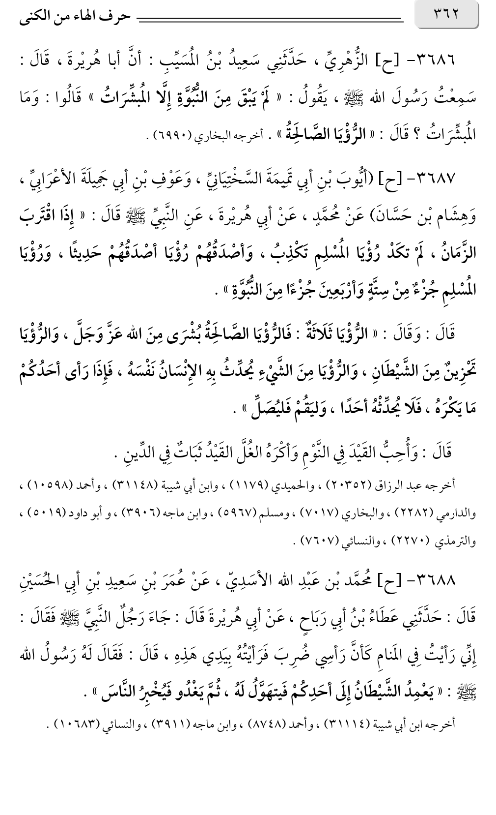 ٣٦٨٦ - [ح] الزُّهْرِيِّ، حَدَّثَنِي سَعِيدُ بْنُ المُسَيِّبِ: أنَّ أبا هُريْرةَ، قَالَ: سَمِعْتُ رَسُولَ الله صلى الله عليه وسلم، يَقُولُ: «لَمْ يَبْقَ مِنَ النُّبُوَّةِ إِلَّا المُبشِّرَاتُ» قَالُوا: وَمَا المُبشِّرَاتُ؟ قَالَ: «الرُّؤْيَا الصَّالِحَةُ». أخرجه البخاري (٦٩٩٠).