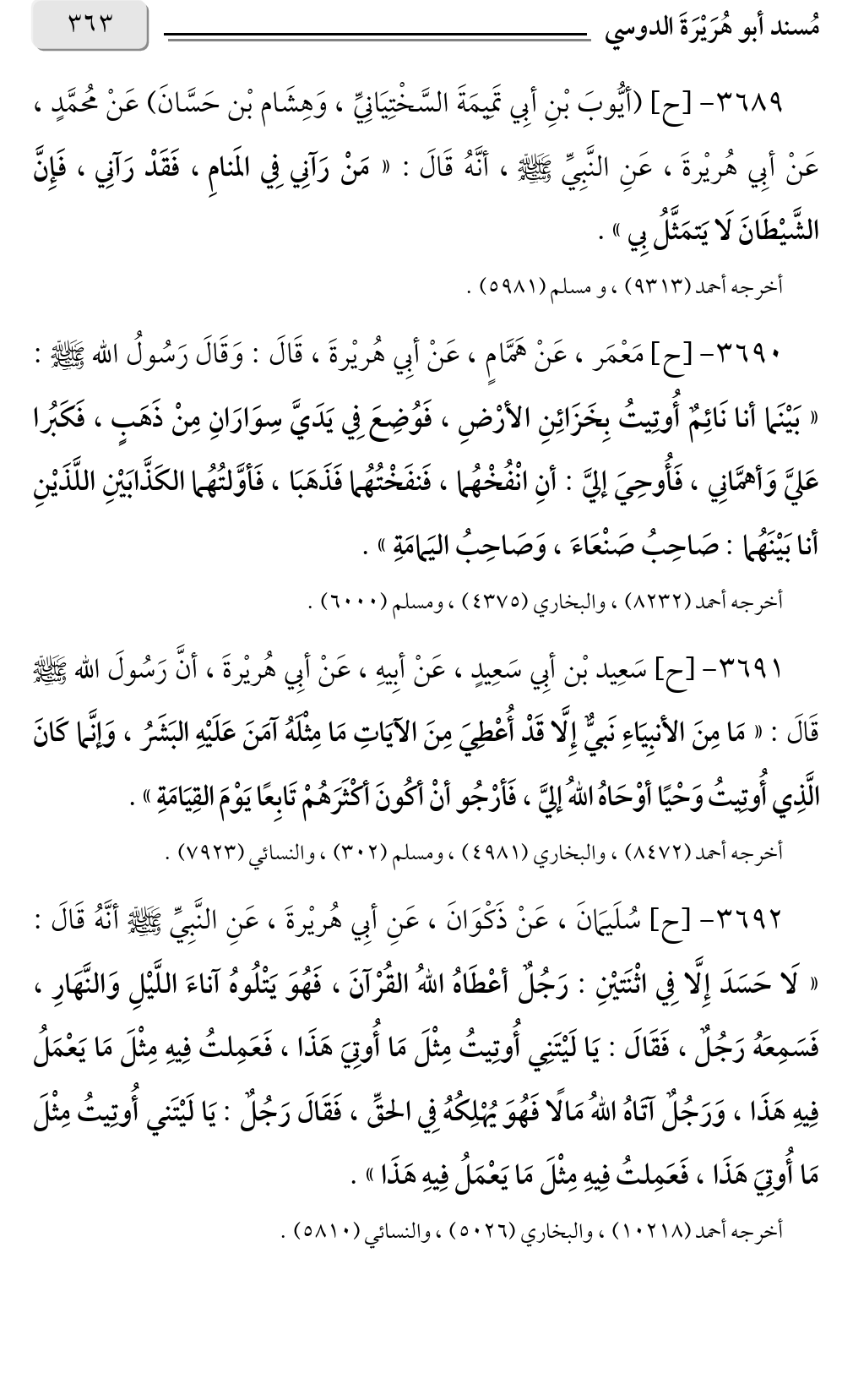 ٣٦٨٩ - [ح] (أيُّوبَ بْنِ أبِي تَميِمَةَ السَّخْتِيَانِيِّ، وَهِشَام بْن حَسَّانَ) عَنْ مُحمَّدٍ، عَنْ أبِي هُريْرةَ، عَنِ النَّبِيِّ صلى الله عليه وسلم، أنَّهُ قَالَ: «مَنْ رَآنِي فِي المَنامِ، فَقَدْ رَآنِي، فَإِنَّ الشَّيْطَانَ لَا يَتمَثَّلُ بِي».