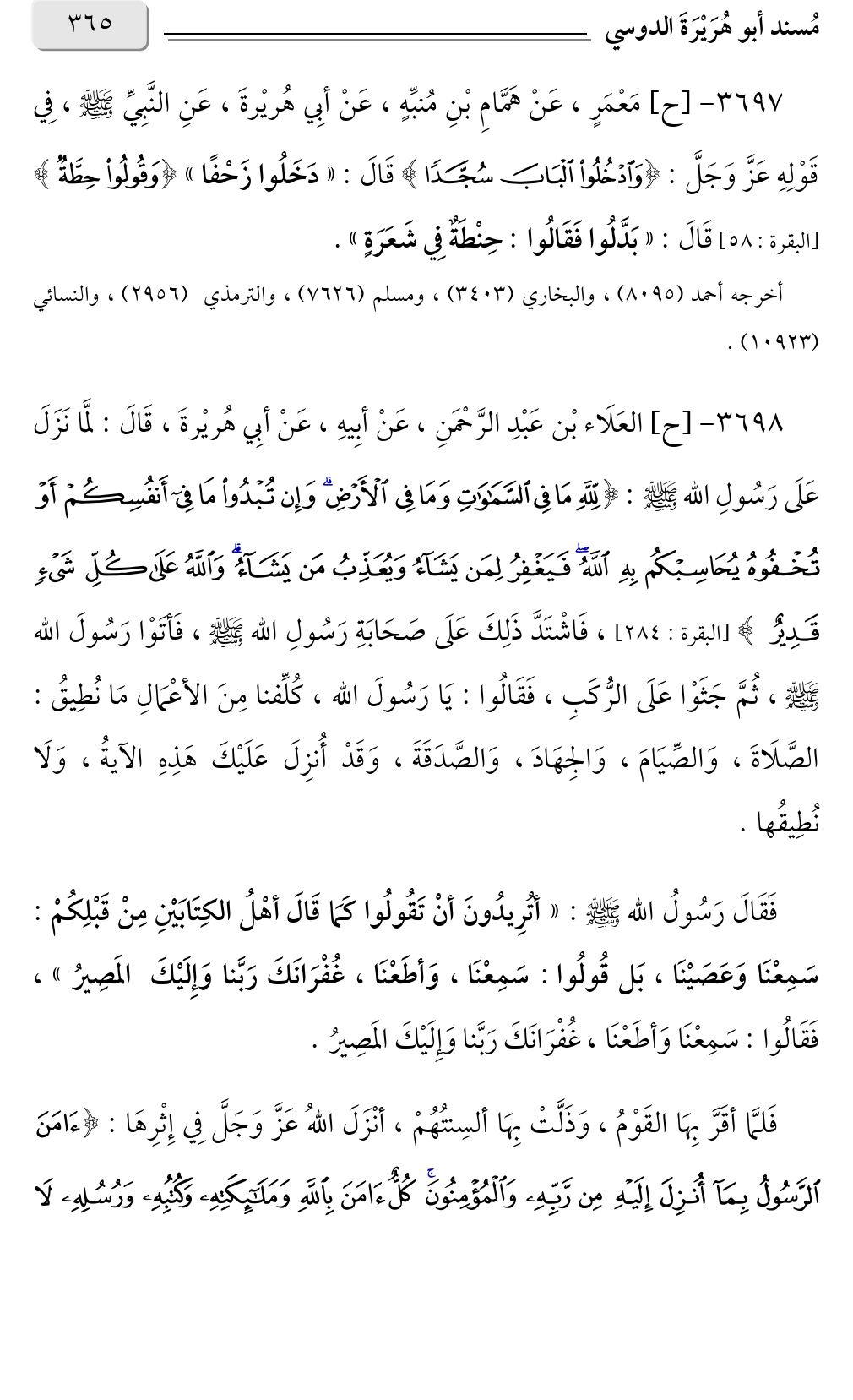 ٣٦٩٨ - [ح] العَلَاء بْن عَبْدِ الرَّحْمَنِ، عَنْ أبِيهِ، عَنْ أبِي هُريْرةَ، قَالَ: لمَّا نَزَلَ عَلَى رَسُولِ الله صلى الله عليه وسلم: {لِلَّهِ مَا فِي السَّمَاوَاتِ وَمَا فِي الْأَرْضِ وَإِنْ تُبْدُوا مَا فِي أَنْفُسِكُمْ أَوْ تُخْفُوهُ يُحَاسِبْكُمْ بِهِ اللَّهُ فَيَغْفِرُ لِمَنْ يَشَاءُ وَيُعَذِّبُ مَنْ يَشَاءُ وَاللَّهُ عَلَى كُلِّ شَيْءٍ قَدِيرٌ} [البقرة: ٢٨٤]، فَاشْتَدَّ ذَلِكَ عَلَى صَحَابَةِ رَسُولِ الله صلى الله عليه وسلم، فَأتَوْا رَسُولَ الله صلى الله عليه وسلم، ثُمَّ جَثَوْا عَلَى الرُّكَبِ، فَقَالُوا: يَا رَسُولَ الله، كُلِّفنا مِنَ الأعْمَالِ مَا نُطِيقُ: الصَّلَاةَ، وَالصِّيَامَ، وَالجِهَادَ، وَالصَّدَقَةَ، وَقَدْ أُنزِلَ عَلَيْكَ هَذِهِ الآيةُ، وَلَا نُطِيقُها.