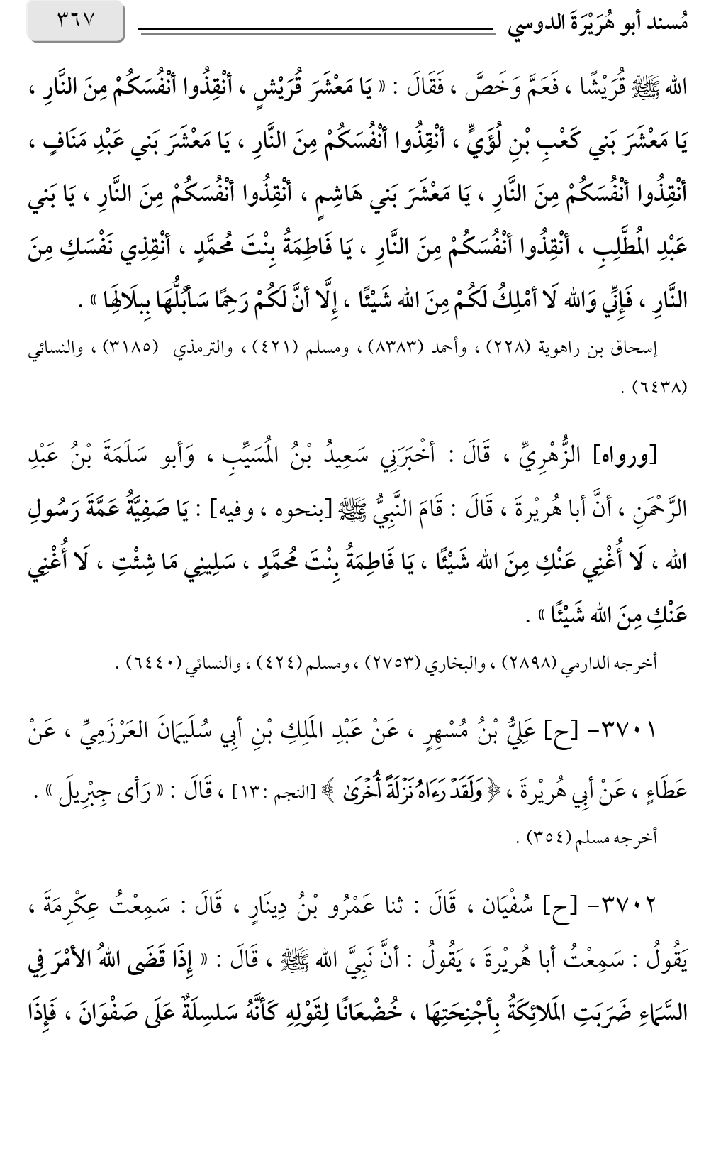[ورواه] الزُّهْرِيِّ، قَالَ: أخْبَرَنِي سَعِيدُ بْنُ المُسَيِّبِ، وَأبو سَلَمَةَ بْنُ عَبْدِ الرَّحْمَنِ، أنَّ أبا هُريْرةَ، قَالَ: قَامَ النَّبِيُّ صلى الله عليه وسلم [بنحوه، وفيه]: يَا صَفِيَّةُ عَمَّةَ رَسُولِ الله، لَا أُغْنِي عَنْكِ مِنَ الله شَيْئًا، يَا فَاطِمَةُ بِنْتَ مُحمَّدٍ، سَلِينِي مَا شِئْتِ، لَا أُغْنِي عَنْكِ مِنَ الله شَيْئًا».