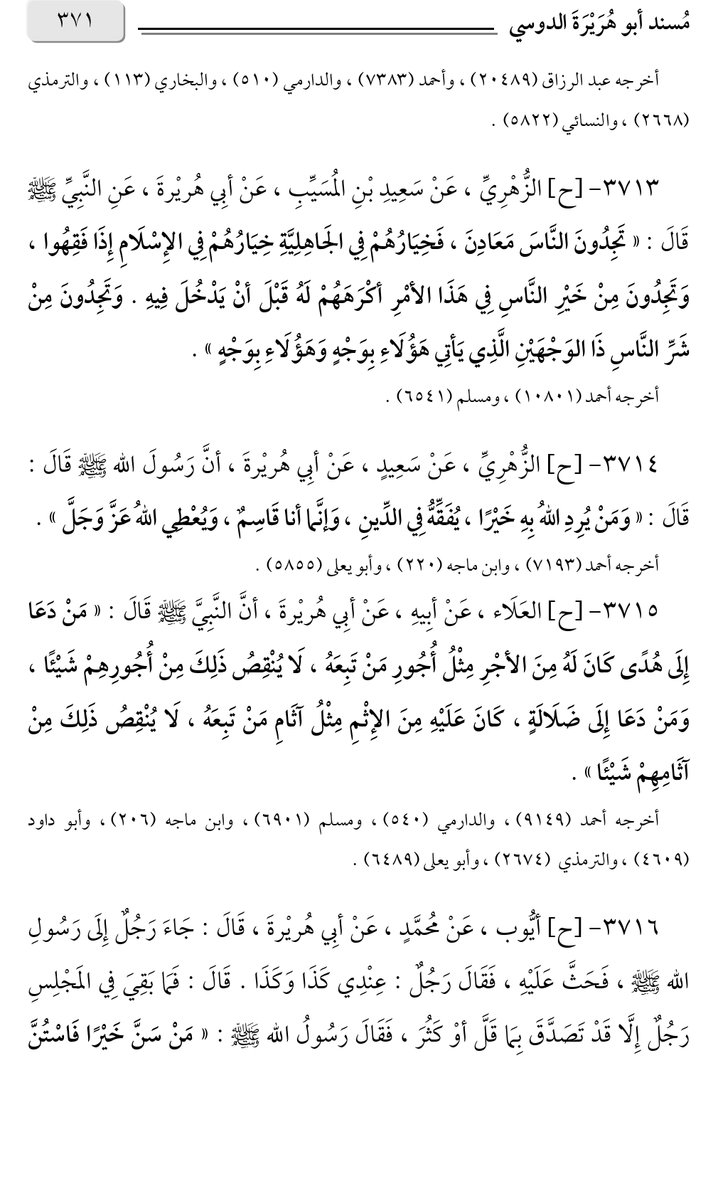 ٣٧١٦ - [ح] أيُّوب، عَنْ مُحمَّدٍ، عَنْ أبِي هُريْرةَ، قَالَ: جَاءَ رَجُلٌ إِلَى رَسُولِ الله صلى الله عليه وسلم، فَحَثَّ عَلَيْهِ، فَقَالَ رَجُلٌ: عِنْدِي كَذَا وَكَذَا. قَالَ: فَمَا بَقِيَ فِي المَجْلِسِ رَجُلٌ إِلَّا قَدْ تَصَدَّقَ بِمَا قَلَّ أوْ كَثُرَ، فَقَالَ رَسُولُ الله صلى الله عليه وسلم: «مَنْ سَنَّ خَيْرًا فَاسْتُنَّ