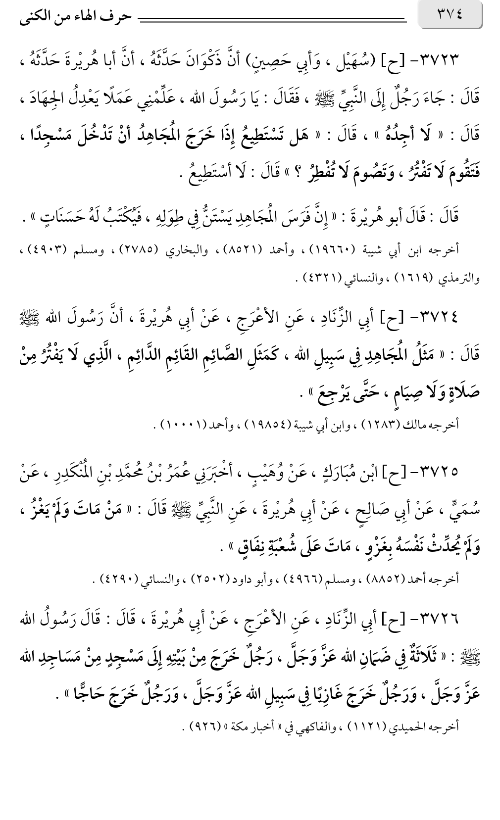 ٣٧٢٣ - [ح] (سُهَيْل، وَأبِي حَصِينٍ) أنَّ ذَكْوَانَ حَدَّثَهُ، أنَّ أبا هُريْرةَ حَدَّثَهُ، قَالَ: جَاءَ رَجُلٌ إِلَى النَّبِيِّ صلى الله عليه وسلم، فَقَالَ: يَا رَسُولَ الله، عَلِّمْنِي عَمَلًا يَعْدِلُ الجِهَادَ، قَالَ: «لَا أجِدُهُ»، قَالَ: «هَل تَسْتَطِيعُ إِذَا خَرَجَ المُجَاهِدُ أنْ تَدْخُلَ مَسْجِدًا، فَتَقُومَ لَا تَفْتُرُ، وَتَصُومَ لَا تُفْطِرُ؟ » قَالَ: لَا أسْتَطِيعُ.