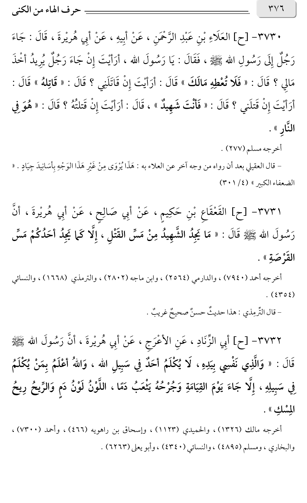 ٣٧٣٠ - [ح] العَلَاءِ بْنِ عَبْدِ الرَّحْمَنِ، عَنْ أبِيهِ، عَنْ أبِي هُريْرةَ، قَالَ: جَاءَ رَجُلٌ إِلَى رَسُولِ الله صلى الله عليه وسلم، فَقَالَ: يَا رَسُولَ الله، أرَأيْتَ إِنْ جَاءَ رَجُلٌ يُرِيدُ أخْذَ مَالِي؟ قَالَ: «فَلَا تُعْطِهِ مَالَكَ» قَالَ: أرَأيْتَ إِنْ قَاتَلَنِي؟ قَالَ: «قَاتِلهُ» قَالَ: أرَأيْتَ إِنْ قَتلَني؟ قَالَ: «فَأنْتَ شَهِيدٌ» قَالَ: أرَأيْتَ إِنْ قَتلتُهُ؟ قَالَ: «هُوَ فِي النَّارِ».