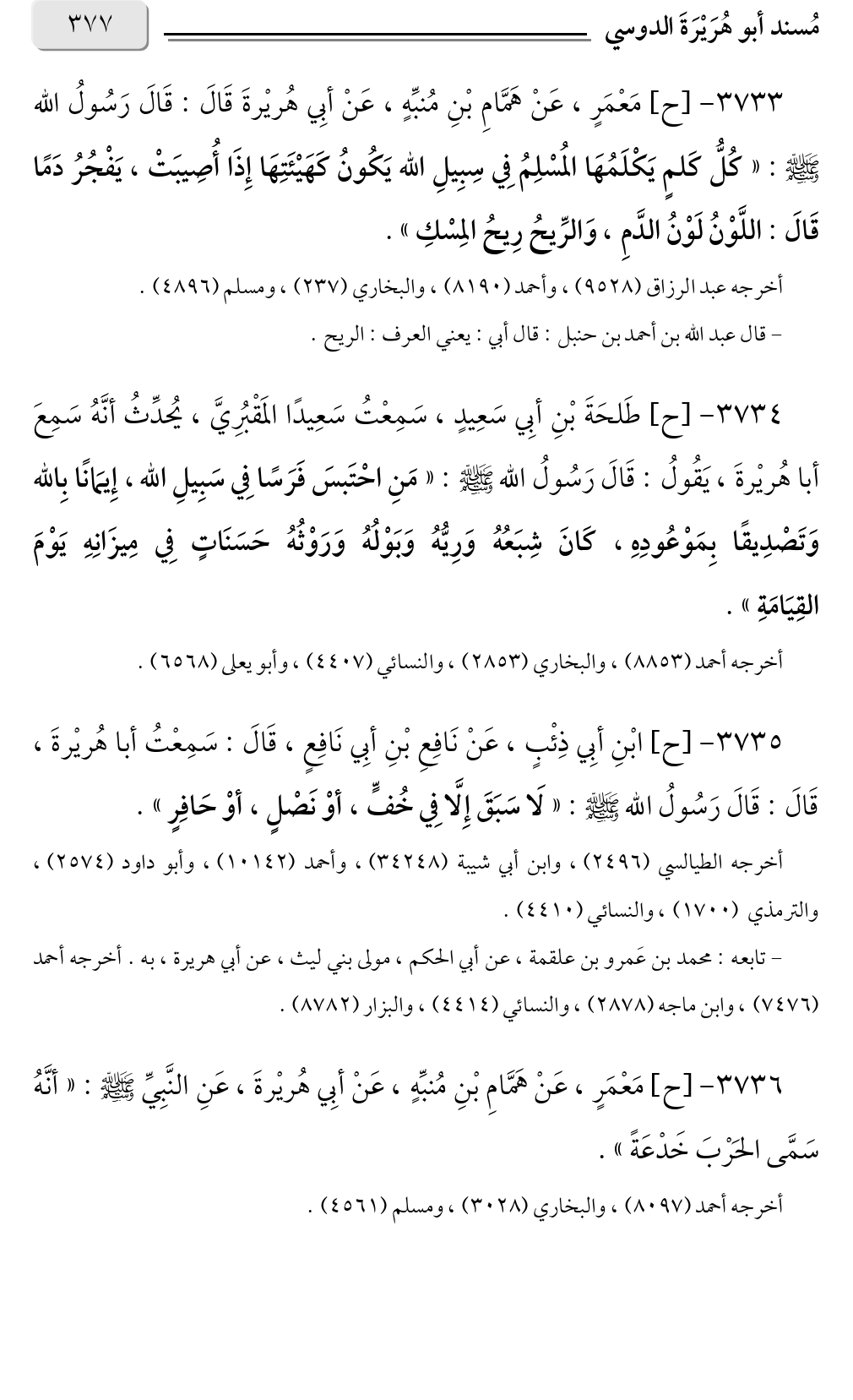 ٣٧٣٣ - [ح] مَعْمَرٍ، عَنْ هَمَّامِ بْنِ مُنبِّهٍ، عَنْ أبِي هُريْرةَ قَالَ: قَالَ رَسُولُ الله صلى الله عليه وسلم: «كُلُّ كَلمٍ يَكْلَمُهَا المُسْلِمُ فِي سِبِيلِ الله يَكُونُ كَهَيْئَتِهَا إِذَا أُصِيبَتْ، يَفْجُرُ دَمًا قَالَ: اللَّوْنُ لَوْنُ الدَّمِ، وَالرِّيحُ رِيحُ المِسْكِ».