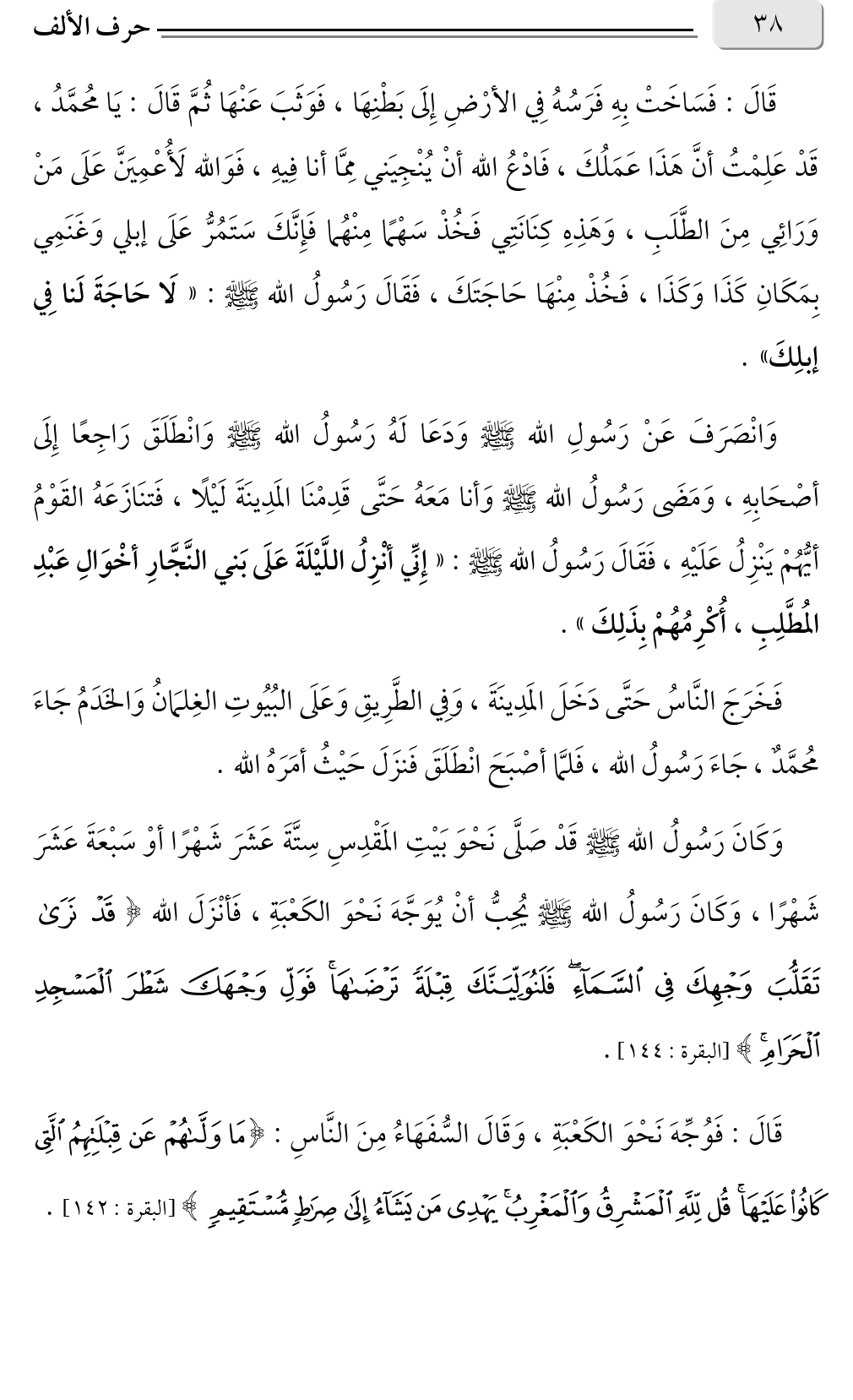 وَكَانَ رَسُولُ الله صلى الله عليه وسلم قَدْ صَلَّى نَحْوَ بَيْتِ المَقْدِسِ سِتَّةَ عَشَرَ شَهْرًا أوْ سَبْعَةَ عَشَرَ m l . شَهْرًا، وَكَانَ رَسُولُ الله صلى الله عليه وسلم يُحِبُّ أنْ يُوَجَّهَ نَحْوَ الكَعْبَةِ، فَأنْزَلَ الله {قَدْ نَرَى تَقَلُّبَ وَجْهِكَ فِي السَّمَاءِ فَلَنُوَلِّيَنَّكَ قِبْلَةً تَرْضَاهَا فَوَلِّ وَجْهَكَ شَطْرَ الْمَسْجِدِ الْحَرَامِ} [البقرة: ١٤٤].