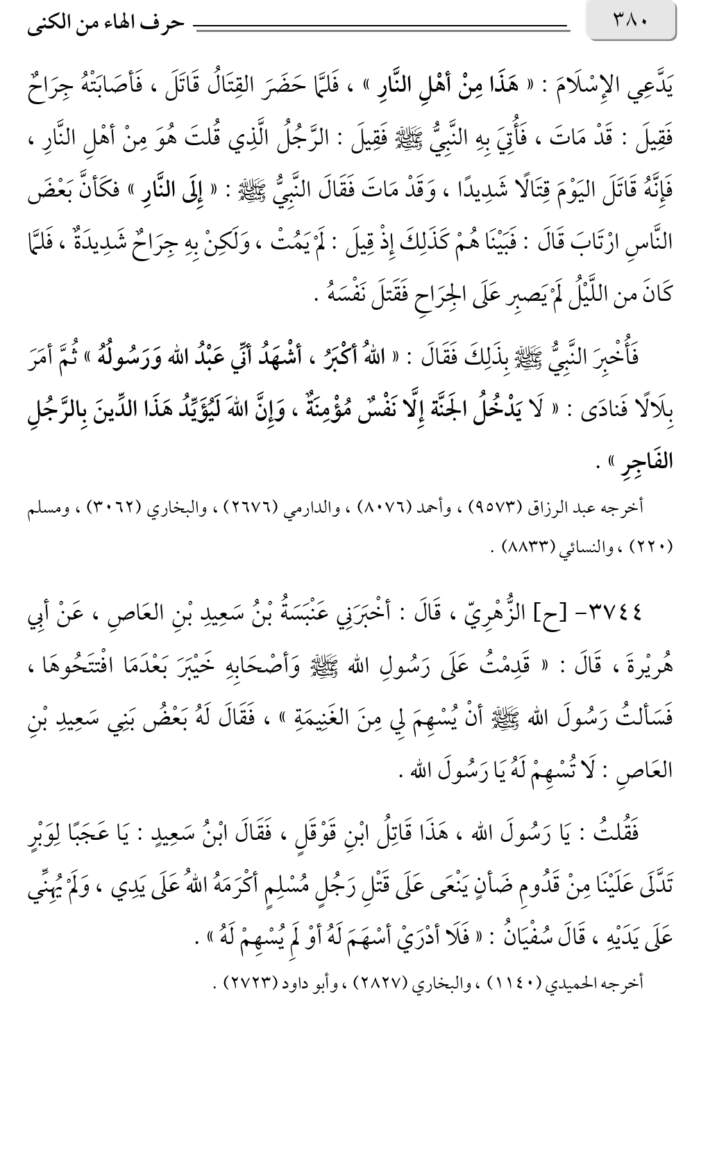 ٣٧٤٤ - [ح] الزُّهْرِيّ، قَالَ: أخْبَرَنِي عَنْبَسَةُ بْنُ سَعِيدِ بْنِ العَاصِ، عَنْ أبِي هُريْرةَ، قَالَ: «قَدِمْتُ عَلَى رَسُولِ الله صلى الله عليه وسلم وَأصْحَابِهِ خَيْبَرَ بَعْدَمَا افْتتَحُوهَا، فَسَألتُ رَسُولَ الله صلى الله عليه وسلم أنْ يُسْهِمَ لِي مِنَ الغَنِيمَةِ» فَقَالَ لَهُ بَعْضُ بَنِي سَعِيدِ بْنِ، العَاصِ: لَا تُسْهِمْ لَهُ يَا رَسُولَ الله.