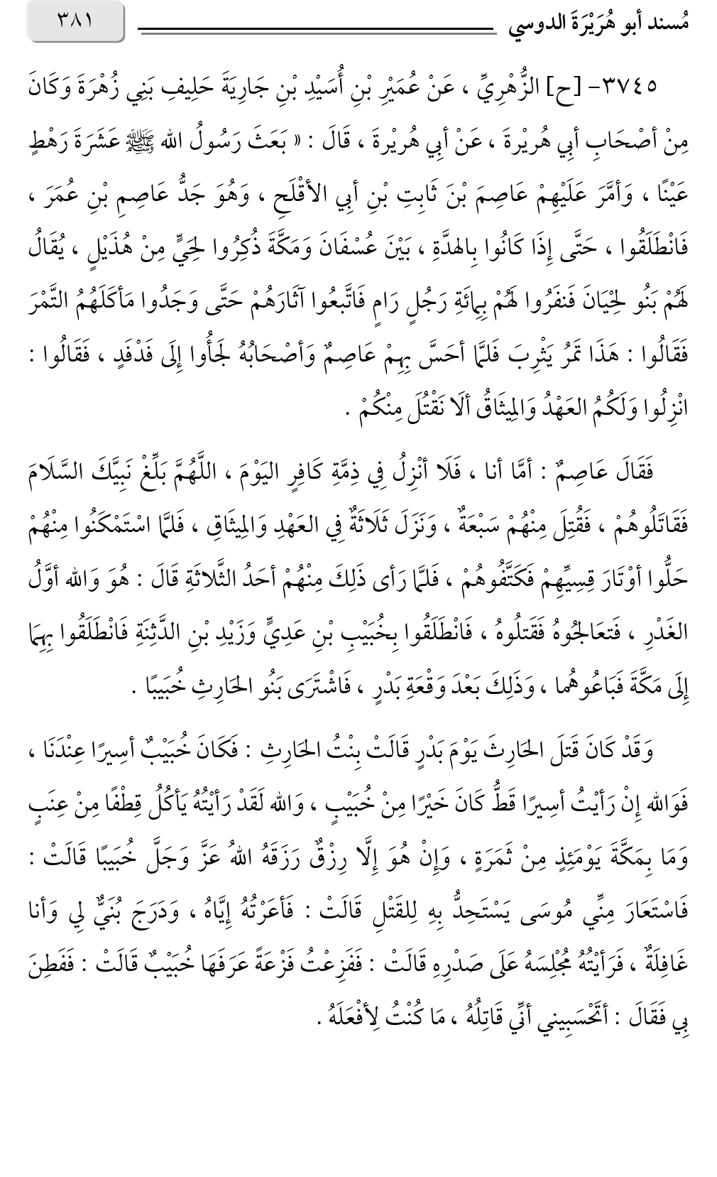٣٧٤٥ - [ح] الزُّهْرِيِّ، عَنْ عُمَيْرِ بْنِ أُسَيْدِ بْنِ جَارِيَةَ حَلِيفِ بَنِي زُهْرَةَ وَكَانَ مِنْ أصْحَابِ أبِي هُريْرةَ، عَنْ أبِي هُريْرةَ، قَالَ: «بَعَثَ رَسُولُ الله صلى الله عليه وسلم عَشَرَةَ رَهْطٍ عَيْنًا، وَأمَّرَ عَلَيْهِمْ عَاصِمَ بْنَ ثَابِتِ بْنِ أبِي الأقْلَحِ، وَهُوَ جَدُّ عَاصِمِ بْنِ عُمَرَ، فَانْطَلَقُوا، حَتَّى إِذَا كَانُوا بِالهدَّةِ، بَيْنَ عُسْفَانَ وَمَكَّةَ ذُكِرُوا لحَيٍّ مِنْ هُذَيْلٍ، يُقَالُ لَهُمْ بَنُو لحْيَانَ فَنفَرُوا لَهُمْ بِمِائَةِ رَجُلٍ رَامٍ فَاتَّبعُوا آثَارَهُمْ حَتَّى وَجَدُوا مَأكَلَهُمُ التَّمْرَ فَقَالُوا: هَذَا تَمرُ يَثْرِبَ فَلمَّا أحَسَّ بِهِمْ عَاصِمٌ وَأصْحَابُهُ لجَأُوا إِلَى فَدْفَدٍ، فَقَالُوا: انْزِلُوا وَلَكُمُ العَهْدُ وَالمِيثَاقُ ألَا نَقْتُلَ مِنْكُمْ.