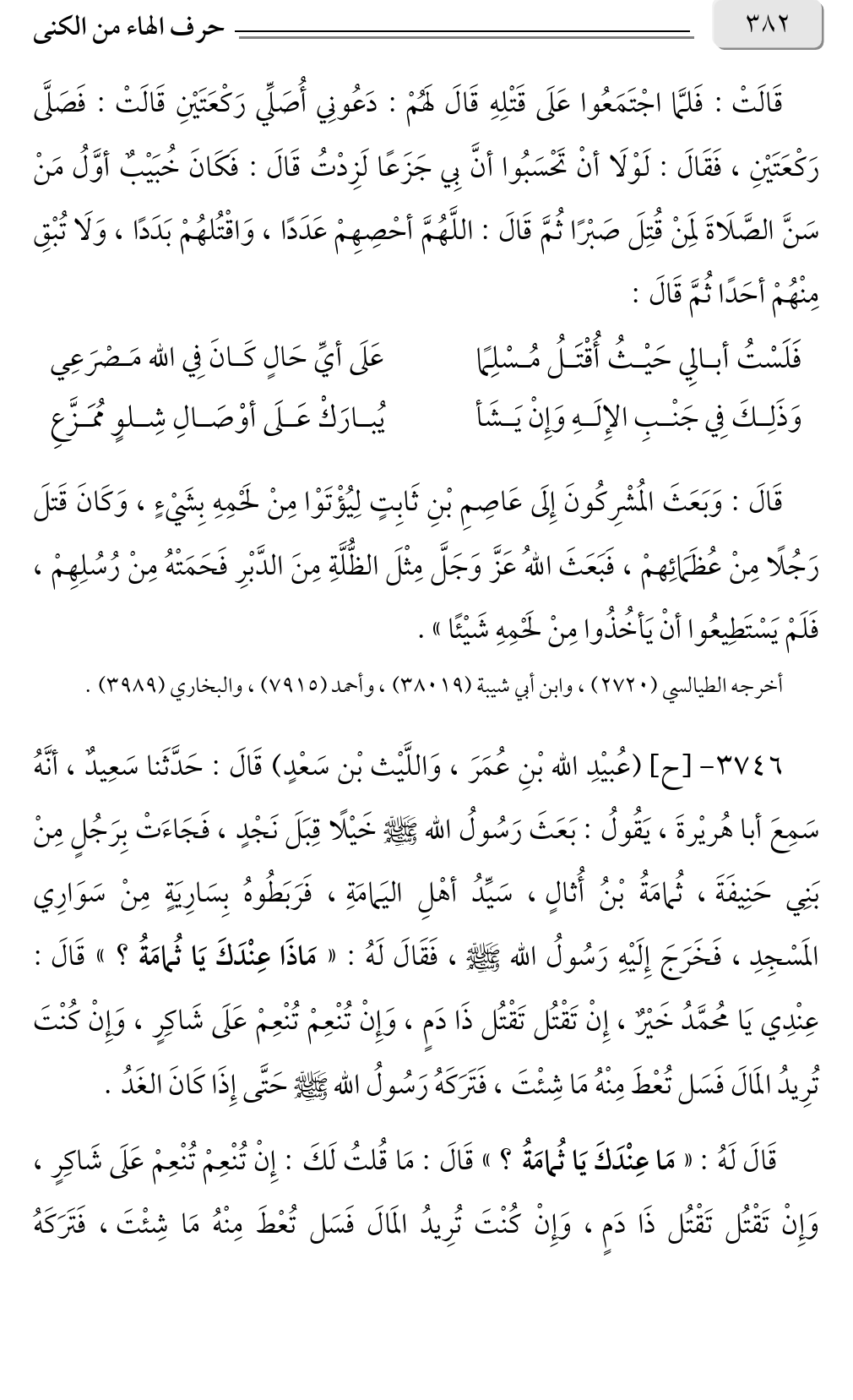 ٣٧٤٦ - [ح] (عُبيْدِ الله بْنِ عُمَرَ، وَاللَّيْث بْن سَعْدٍ) قَالَ: حَدَّثَنا سَعِيدٌ، أنَّهُ سَمِعَ أبا هُريْرةَ، يَقُولُ: بَعَثَ رَسُولُ الله صلى الله عليه وسلم خَيْلًا قِبَلَ نَجْدٍ، فَجَاءَتْ بِرَجُلٍ مِنْ بَنِي حَنِيفَةَ، ثُمامَةُ بْنُ أُثالٍ، سَيِّدُ أهْلِ اليَمامَةِ، فَرَبَطُوهُ بِسَارِيَةٍ مِنْ سَوَارِي المَسْجِدِ، فَخَرَجَ إِلَيْهِ رَسُولُ الله صلى الله عليه وسلم، فَقَالَ لَهُ: «مَاذَا عِنْدَكَ يَا ثُمامَةُ؟ » قَالَ: عِنْدِي يَا مُحمَّدُ خَيْرٌ، إِنْ تَقْتُل تَقْتُل ذَا دَمٍ، وَإِنْ تُنْعِمْ تُنْعِمْ عَلَى شَاكِرٍ، وَإِنْ كُنْتَ تُرِيدُ المَالَ فَسَل تُعْطَ مِنْهُ مَا شِئْتَ، فَتَرَكَهُ رَسُولُ الله صلى الله عليه وسلم حَتَّى إِذَا كَانَ الغَدُ. قَالَ لَهُ: «مَا عِنْدَكَ يَا ثُمامَةُ؟ » قَالَ: مَا قُلتُ لَكَ: إِنْ تُنْعِمْ تُنْعِمْ عَلَى شَاكِرٍ، وَإِنْ تَقْتُل تَقْتُل ذَا دَمٍ، وَإِنْ كُنْتَ تُرِيدُ المَالَ فَسَل تُعْطَ مِنْهُ مَا شِئْتَ، فَتَرَكَهُ