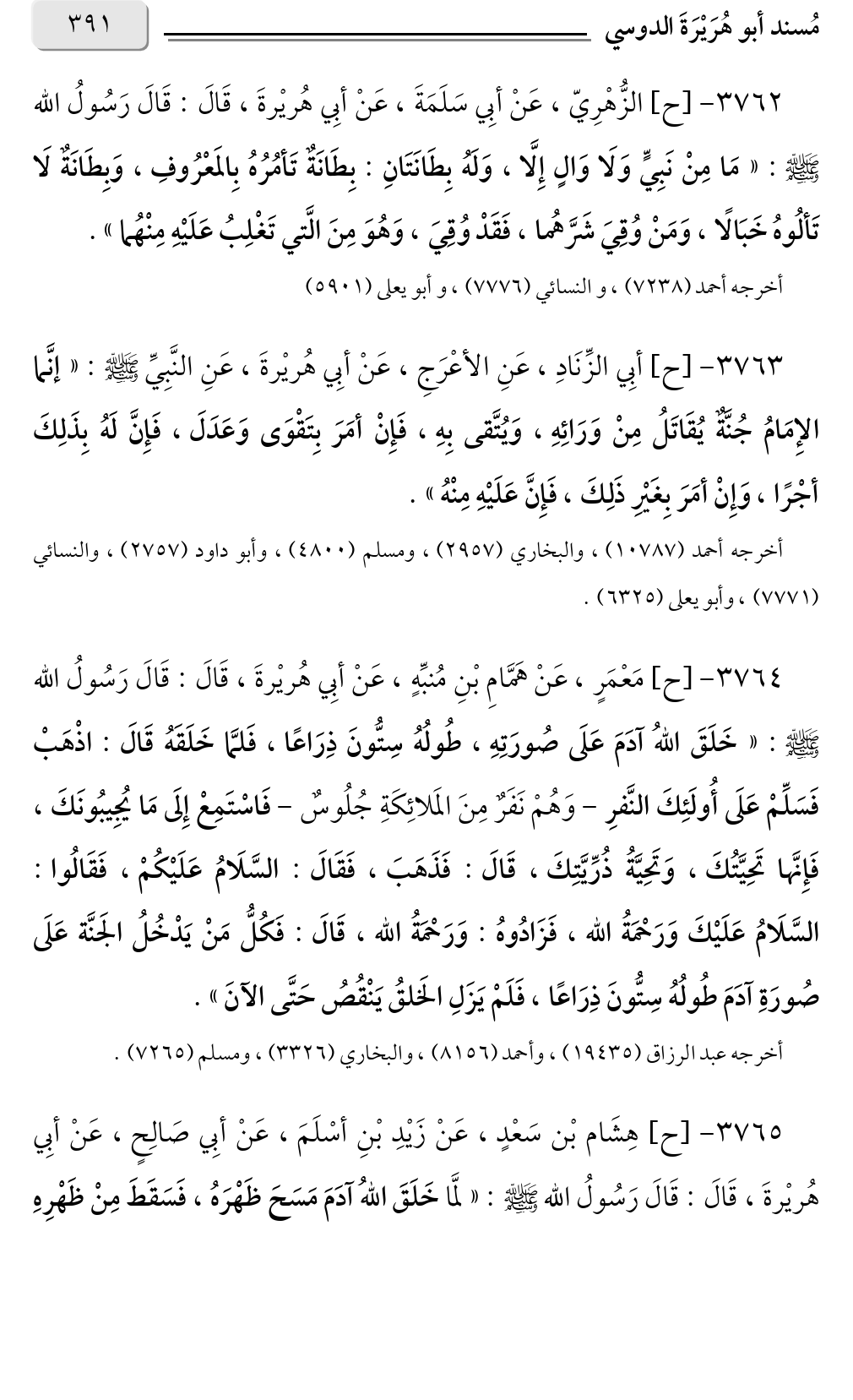 ٣٧٦٤ - [ح] مَعْمَرٍ، عَنْ هَمَّامِ بْنِ مُنبِّهٍ، عَنْ أبِي هُريْرةَ، قَالَ: قَالَ رَسُولُ الله صلى الله عليه وسلم: «خَلَقَ اللهُ آدَمَ عَلَى صُورَتِهِ، طُولُهُ سِتُّونَ ذِرَاعًا، فَلمَّا خَلَقَهُ قَالَ: اذْهَبْ فَسَلِّمْ عَلَى أُولَئِكَ النَّفرِ - وَهُمْ نَفَرٌ مِنَ المَلائِكَةِ جُلُوسٌ - فَاسْتَمِعْ إِلَى مَا يُجِيبُونَكَ، فَإِنَّها تَحِيَّتُكَ، وَتَحِيَّةُ ذُرِّيَّتِكَ، قَالَ: فَذَهَبَ، فَقَالَ: السَّلَامُ عَلَيْكُمْ، فَقَالُوا: السَّلَامُ عَلَيْكَ وَرَحْمَةُ الله، فَزَادُوهُ: وَرَحْمَةُ الله، قَالَ: فَكُلُّ مَنْ يَدْخُلُ الجَنَّة عَلَى صُورَةِ آدَمَ طُولُهُ سِتُّونَ ذِرَاعًا، فَلَمْ يَزَلِ الخَلقُ يَنْقُصُ حَتَّى الآنَ».