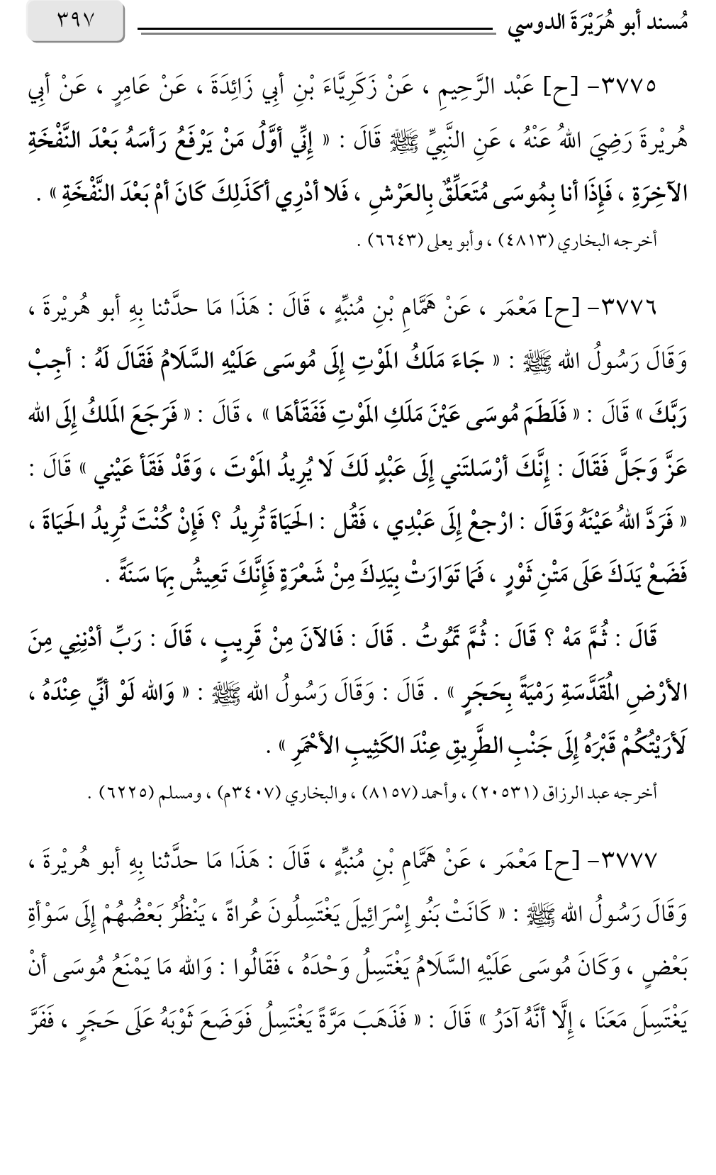 ٣٧٧٦ - [ح] مَعْمَر، عَنْ هَمَّامِ بْنِ مُنبِّهٍ، قَالَ: هَذَا مَا حدَّثنا بِهِ أبو هُريْرةَ، وَقَالَ رَسُولُ الله صلى الله عليه وسلم: «جَاءَ مَلَكُ المَوْتِ إِلَى مُوسَى عَلَيْهِ السَّلَامُ فَقَالَ لَهُ: أجِبْ رَبَّكَ» قَالَ: «فَلَطَمَ مُوسَى عَيْنَ مَلَكِ المَوْتِ فَفَقَأهَا»، قَالَ: «فَرَجَعَ المَلكُ إِلَى الله عَزَّ وَجَلَّ فَقَالَ: إِنَّكَ أرْسَلتَني إِلَى عَبْدٍ لَكَ لَا يُرِيدُ المَوْتَ، وَقَدْ فَقَأ عَيْني» قَالَ: «فَرَدَّ اللهُ عَيْنَهُ وَقَالَ: ارْجعْ إِلَى عَبْدِي، فَقُل: الحَيَاةَ تُرِيدُ؟ فَإِنْ كُنْتَ تُرِيدُ الحَيَاةَ، فَضَعْ يَدَكَ عَلَى مَتْنِ ثَوْرٍ، فَمَا تَوَارَتْ بِيَدِكَ مِنْ شَعْرَةٍ فَإِنَّكَ تَعِيشُ بِهَا سَنَةً.