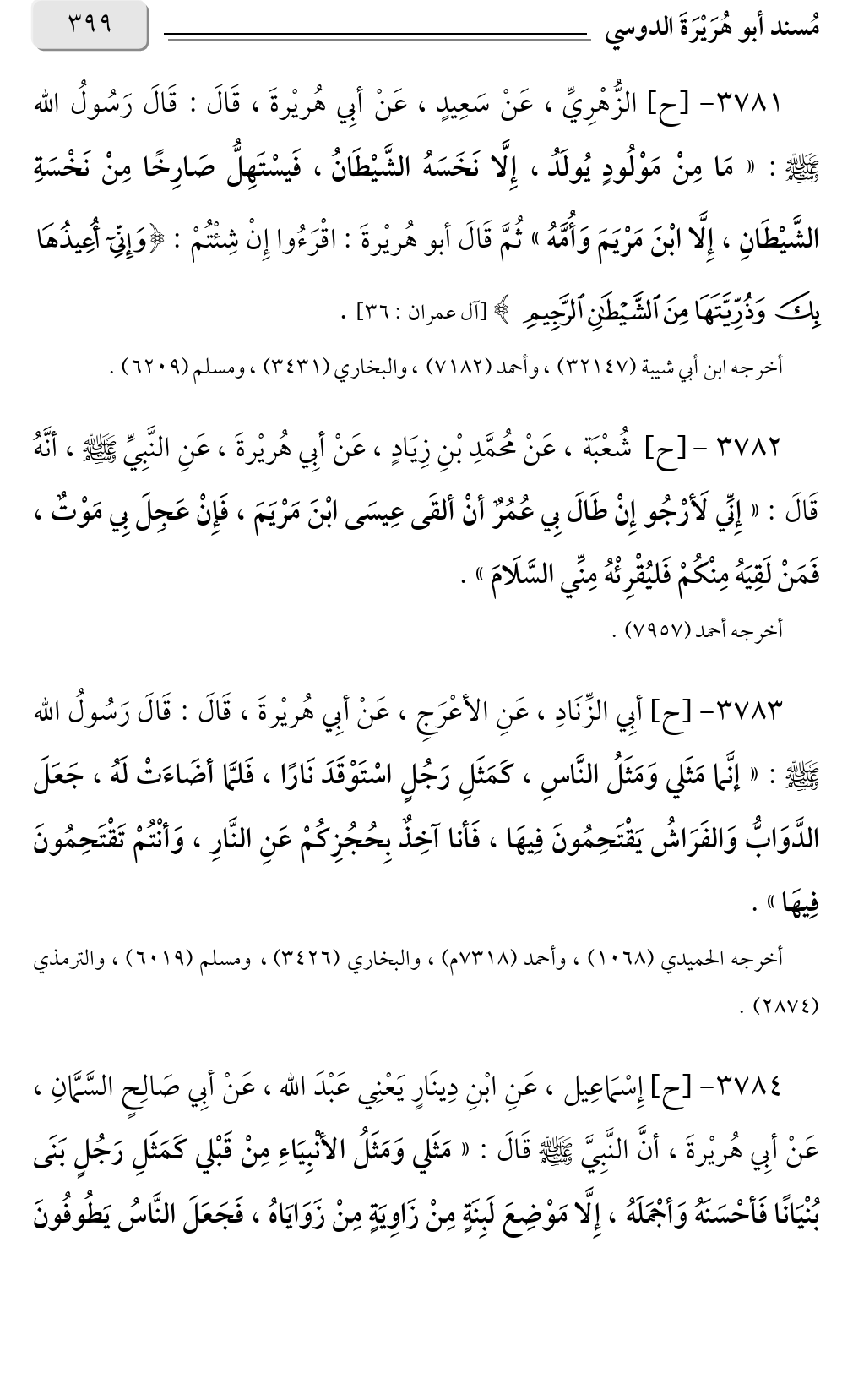 ٣٧٨١ - [ح] الزُّهْرِيِّ، عَنْ سَعِيدٍ، عَنْ أبِي هُريْرةَ، قَالَ: قَالَ رَسُولُ الله صلى الله عليه وسلم: «مَا مِنْ مَوْلُودٍ يُولَدُ، إِلَّا نَخَسَهُ الشَّيْطَانُ، فَيسْتَهِلُّ صَارِخًا مِنْ نَخْسَةِ الشَّيْطَانِ، إِلَّا ابْنَ مَرْيَمَ وَأُمَّهُ» ثُمَّ قَالَ أبو هُريْرةَ: اقْرَءُوا إِنْ شِئْتُمْ {وَإِنِّي أُعِيذُهَا بِكَ وَذُرِّيَّتَهَا مِنَ الشَّيْطَانِ الرَّجِيمِ} [آل عمران: ٣٦].