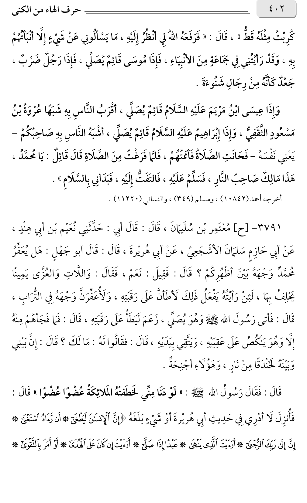 ٣٧٩١ - [ح] مُعْتَمِر بْن سُلَيمَانَ، قَالَ: قَالَ أبِي: حَدَّثَنِي نُعَيْم بْن أبِي هِنْدٍ، عَنْ أبِي حَازِمٍ سَلمَانَ الأشْجَعِيِّ، عَنْ أبِي هُريْرةَ، قَالَ: قَالَ أبو جَهْلٍ: هَل يُعَفِّرُ مُحمَّدٌ وَجْهَهُ بَيْنَ أظْهُرِكُمْ؟ قَالَ: فَقِيلَ: نَعَمْ، فَقَالَ: وَاللَّاتِ وَالعُزَّى يَمِينًا يَحْلِفُ بِهَا، لَئِنْ رَأيْتُهُ يَفْعَلُ ذَلِكَ لَأطَأنَّ عَلَى رَقَبَتِهِ، وَلَأُعَفِّرَنَّ وَجْهَهُ فِي التُّرَابِ، قَالَ: فَأتى رَسُولَ الله صلى الله عليه وسلم وَهُوَ يُصَلِّي، زَعَمَ لَيَطَأُ عَلَى رَقَبَتِهِ، قَالَ: فَمَا فَجَأهُمْ مِنْهُ إِلَّا وَهُوَ يَنْكُصُ عَلَى عَقِبَيْهِ، وَيَتَّقِي بِيَدَيْهِ، قَالَ: فقَالُوا لَهُ: مَا لَكَ؟ قَالَ: إِنَّ بَيْنِي وَبَيْنَهُ لَخَنْدَقًا مِنْ نَارٍ، وَهَؤُلَاءِ أجْنِحَةٌ.