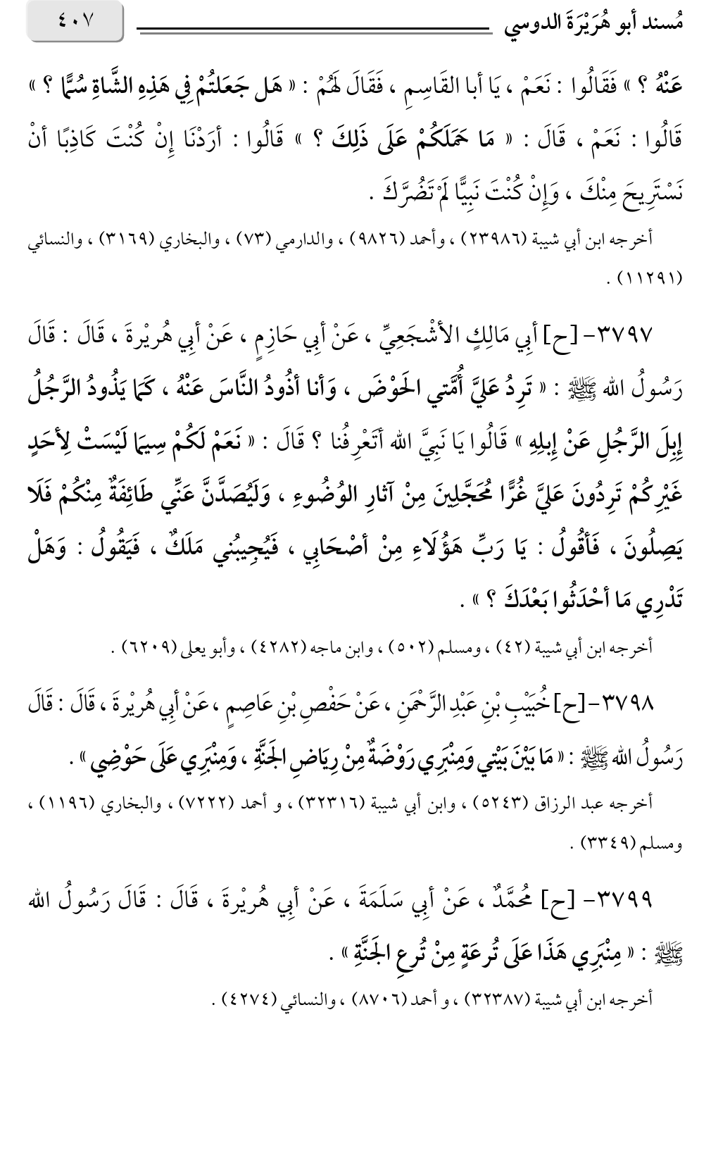 ٣٧٩٧ - [ح] أبِي مَالِكٍ الأشْجَعِيِّ، عَنْ أبِي حَازِمٍ، عَنْ أبِي هُريْرةَ، قَالَ: قَالَ رَسُولُ الله صلى الله عليه وسلم: «تَرِدُ عَليَّ أُمَّتي الحَوْضَ، وَأنا أذُودُ النَّاسَ عَنْهُ، كَمَا يَذُودُ الرَّجُلُ إِبِلَ الرَّجُلِ عَنْ إِبلِهِ» قَالُوا يَا نَبِيَّ الله أتَعْرِفُنا؟ قَالَ: «نَعَمْ لَكُمْ سِيمَا لَيْسَتْ لِأحَدٍ را مُحَجَّلِينَ مِنْ آثارِ الوُضُوءِ، وَلَيُصَدَّنَّ عَنِّي طَائِفَةٌ مِنْكُمْ فَلَا .. غَيْرِكُمْ تَرِدُونَ عَليَّ غُ يَصِلُونَ، فَأقُولُ: يَا رَبِّ هَؤُلَاءِ مِنْ أصْحَابِي، فَيُجِيبُني مَلَكٌ، فَيَقُولُ: وَهَلْ تَدْرِي مَا أحْدَثُوا بَعْدَكَ؟ ».