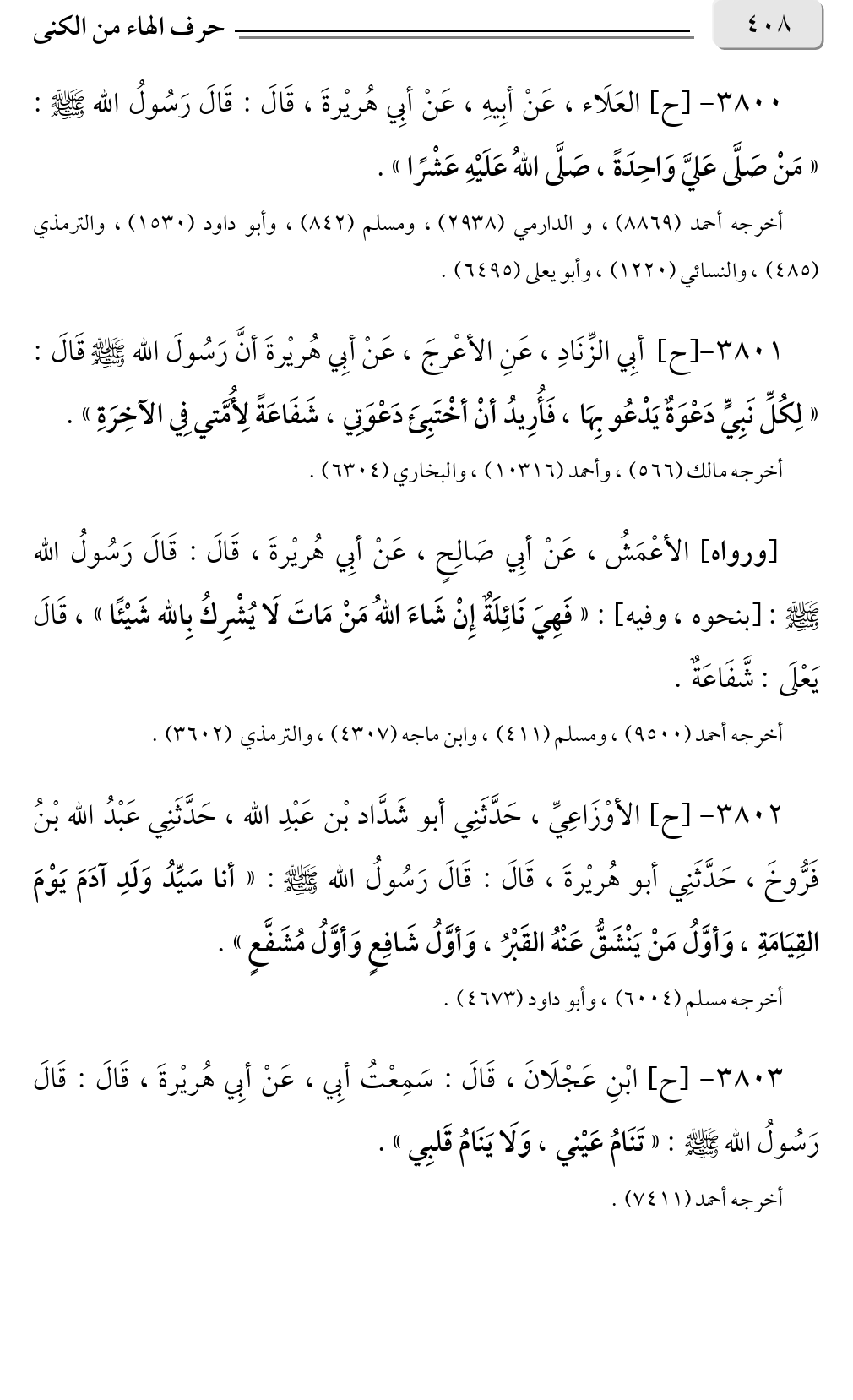 ٣٨٠٠ - [ح] العَلَاء، عَنْ أبِيهِ، عَنْ أبِي هُريْرةَ، قَالَ: قَالَ رَسُولُ الله صلى الله عليه وسلم: «مَنْ صَلَّى عَليَّ وَاحِدَةً، صَلَّى اللهُ عَلَيْهِ عَشْرًا».