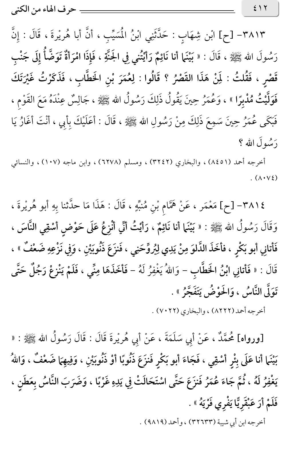 [ورواه] مُحمَّدٌ، عَنْ أبِي سَلَمَةَ، عَنْ أبِي هُريْرةَ قَالَ: قَالَ رَسُولُ الله صلى الله عليه وسلم: «بَيْنَما أنا عَلَى بِئْرٍ أسْقِي، فَجَاءَ أبو بَكْرٍ فَنزَعَ ذَنُوبًا أوْ ذَنُوبَيْنِ، وَفِيهِمَا ضَعْفٌ، وَاللهُ يَغْفِرُ لَهُ، ثُمَّ جَاءَ عُمَرُ فَنزَعَ حَتَّى اسْتَحَالَتْ فِي يَدِهِ غَرْبًا، وَضَرَبَ النَّاسُ بِعَطَنٍ، فَلَمْ أرَ عَبْقَرِيًّا يَفْرِي فَرْيَهُ».