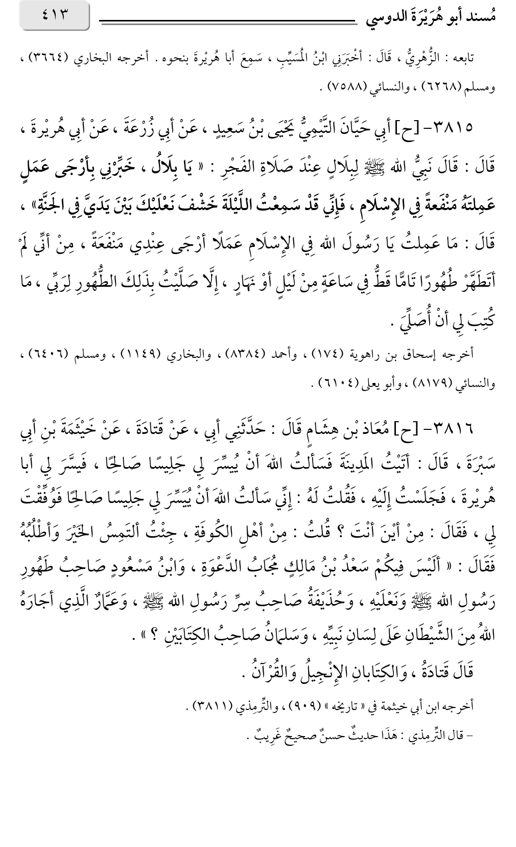 ٣٨١٥ - [ح] أبِي حَيَّانَ التَّيْمِيُّ يَحْيَى بْنُ سَعِيدٍ، عَنْ أبِي زُرْعَةَ، عَنْ أبِي هُريْرةَ، قَالَ: قَالَ نَبِيُّ الله صلى الله عليه وسلم لِبِلَالٍ عِنْدَ صَلَاةِ الفَجْرِ: «يَا بِلَالُ، خَبِّرْنِي بِأرْجَى عَمَلٍ عَمِلتَهُ مَنْفَعةً فِي الإِسْلَامِ، فَإِنِّي قَدْ سَمِعْتُ اللَّيْلَةَ خَشْفَ نَعْلَيْكَ بَيْنَ يَدَيَّ فِي الجَنَّةِ»، قَالَ: مَا عَمِلتُ يَا رَسُولَ الله فِي الإِسْلَامِ عَمَلًا أرْجَى عِنْدِي مَنْفَعَةً، مِنْ أنِّي لَمْ أتَطَهَّرْ طُهُورًا تَامًّا قَطُّ فِي سَاعَةٍ مِنْ لَيْلٍ أوْ نَهَارٍ، إِلَّا صَلَّيْتُ بِذَلِكَ الطُّهُورِ لِرَبِّي، مَا كُتِبَ لِي أنْ أُصَلِّيَ.