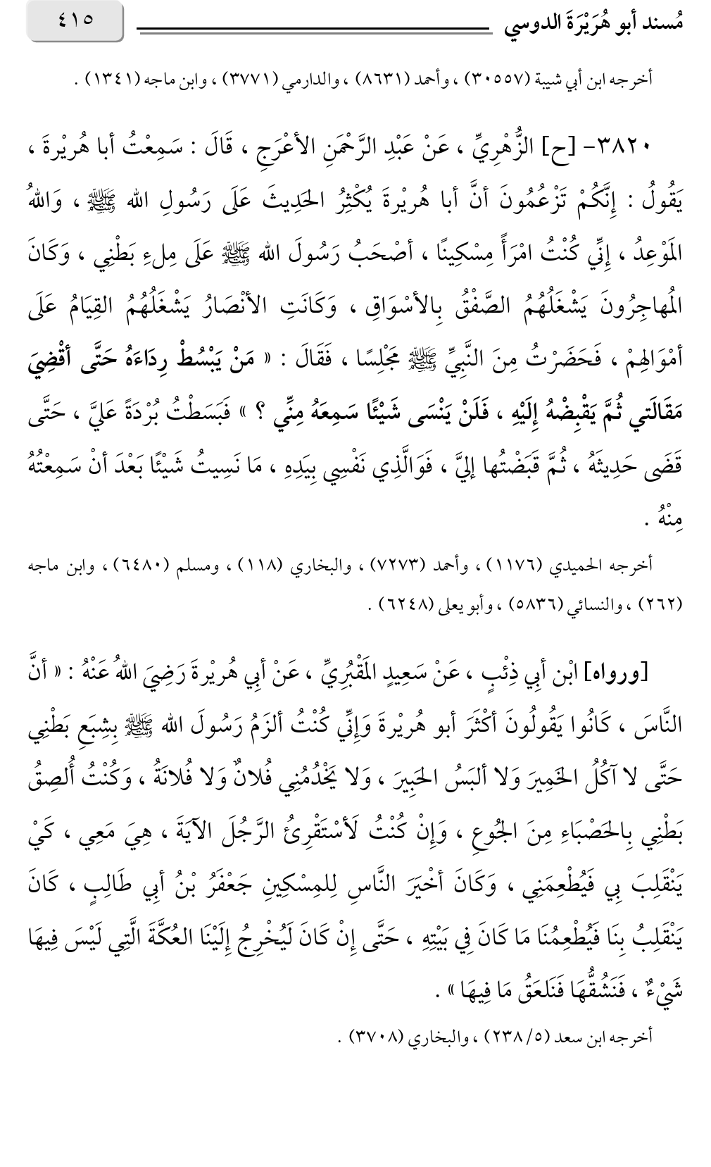 ٣٨٢٠ - [ح] الزُّهْرِيِّ، عَنْ عَبْدِ الرَّحْمَنِ الأعْرَجِ، قَالَ: سَمِعْتُ أبا هُريْرةَ، يَقُولُ: إِنَّكُمْ تَزْعُمُونَ أنَّ أبا هُريْرةَ يُكْثِرُ الحَدِيثَ عَلَى رَسُولِ الله صلى الله عليه وسلم، وَاللهُ المَوْعِدُ، إِنِّي كُنْتُ امْرَأً مِسْكِينًا، أصْحَبُ رَسُولَ الله صلى الله عليه وسلم عَلَى مِلءِ بَطْنِي، وَكَانَ المُهاجِرُونَ يَشْغَلُهُمُ الصَّفْقُ بِالأسْوَاقِ، وَكَانَتِ الأنْصَارُ يَشْغَلُهُمُ القِيَامُ عَلَى أمْوَالهِمْ، فَحَضَرْتُ مِنَ النَّبِيِّ صلى الله عليه وسلم مَجْلِسًا، فَقَالَ: «مَنْ يَبْسُطْ رِدَاءَهُ حَتَّى أقْضِيَ مَقَالَتي ثُمَّ يَقْبِضْهُ إِلَيْهِ، فَلَنْ يَنْسَى شَيْئًا سَمِعَهُ مِنِّي؟ » فَبَسَطْتُ بُرْدَةً عَليَّ، حَتَّى قَضَى حَدِيثَهُ، ثُمَّ قَبَضْتُها إليَّ، فَوَالَّذِي نَفْسِي بِيَدِهِ، مَا نَسِيتُ شَيْئًا بَعْدَ أنْ سَمِعْتُهُ مِنْهُ.