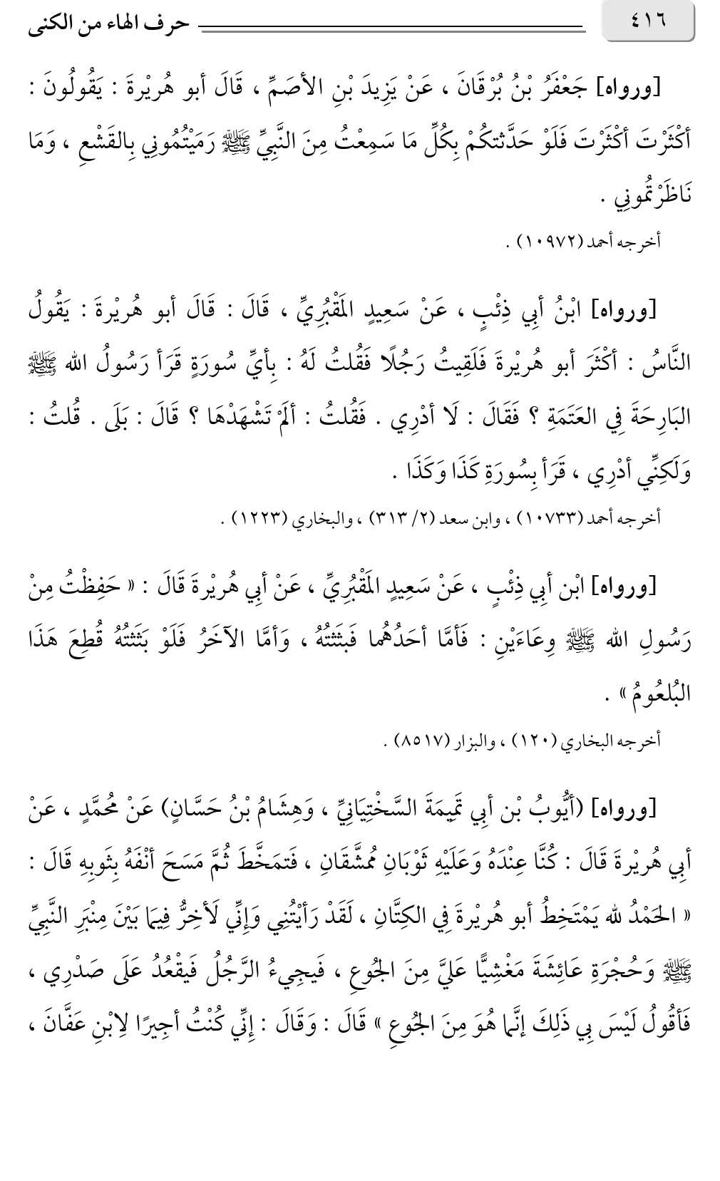 [ورواه] ابْنُ أبِي ذِئْبٍ، عَنْ سَعِيدٍ المَقْبُرِيِّ، قَالَ: قَالَ أبو هُريْرةَ: يَقُولُ النَّاسُ: أكْثَرَ أبو هُريْرةَ فَلَقِيتُ رَجُلًا فَقُلتُ لَهُ: بِأيِّ سُورَةٍ قَرَأ رَسُولُ الله صلى الله عليه وسلم البَارِحَةَ فِي العَتَمَةِ؟ فَقَالَ: لَا أدْرِي. فَقُلتُ: ألَمْ تَشْهَدْهَا؟ قَالَ: بَلَى. قُلتُ: وَلَكِنِّي أدْرِي، قَرَأ بِسُورَةِ كَذَا وَكَذَا.