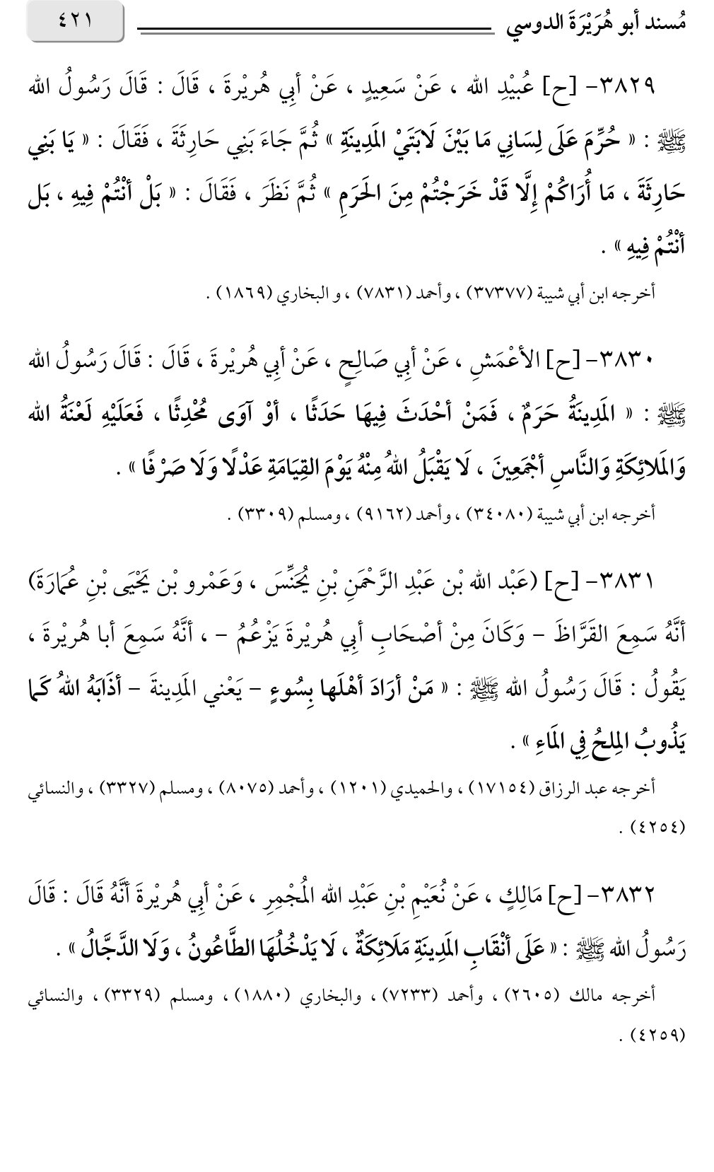 ٣٨٢٩ - [ح] عُبيْدِ الله، عَنْ سَعِيدٍ، عَنْ أبِي هُريْرةَ، قَالَ: قَالَ رَسُولُ الله صلى الله عليه وسلم: «حُرِّمَ عَلَى لِسَانِي مَا بَيْنَ لَابَتَيْ المَدِينَةِ» ثُمَّ جَاءَ بَنِي حَارِثَةَ، فَقَالَ: «يَا بَنِي حَارِثَةَ، مَا أُرَاكُمْ إِلَّا قَدْ خَرَجْتُمْ مِنَ الحَرَمِ» ثُمَّ نَظَرَ، فَقَالَ: «بَلْ أنْتُمْ فِيهِ، بَل أنْتُمْ فِيهِ».