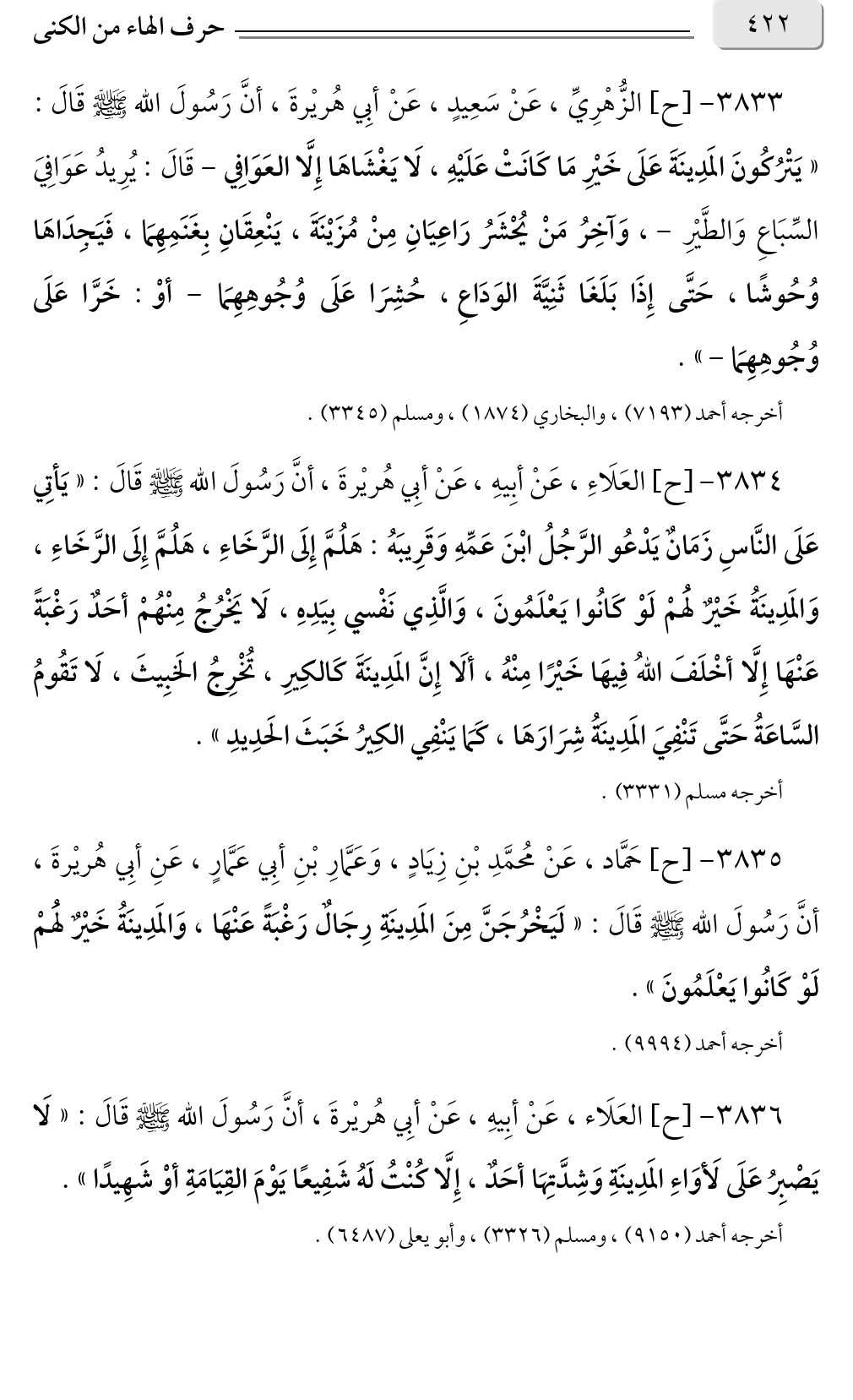 ٣٨٣٣ - [ح] الزُّهْرِيِّ، عَنْ سَعِيدٍ، عَنْ أبِي هُريْرةَ، أنَّ رَسُولَ الله صلى الله عليه وسلم قَالَ: «يَتْرُكُونَ المَدِينَةَ عَلَى خَيْرِ مَا كَانَتْ عَلَيْهِ، لَا يَغْشَاهَا إِلَّا العَوَافِي - قَالَ: يُرِيدُ عَوَافِيَ السِّبَاعِ وَالطَّيْرِ -، وَآخِرُ مَنْ يُحْشَرُ رَاعِيَانِ مِنْ مُزَيْنَةَ، يَنْعِقَانِ بِغَنَمِهِمَا، فَيَجِدَاهَا وُحُوشًا، حَتَّى إِذَا بَلَغَا ثَنِيَّةَ الوَدَاعِ، حُشِرَا عَلَى وُجُوهِهِمَا - أوْ: خَرَّا عَلَى وُجُوهِهِمَا-».