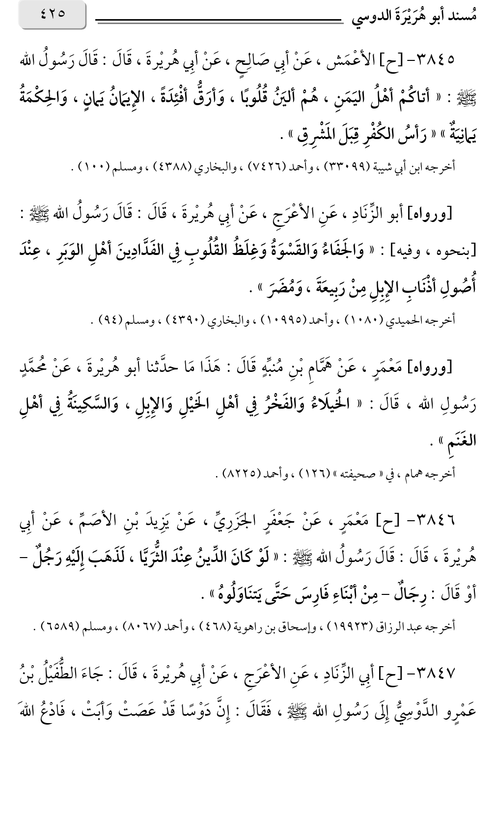 ٣٨٤٥ - [ح] الأعْمَش، عَنْ أبِي صَالِحٍ، عَنْ أبِي هُريْرةَ، قَالَ: قَالَ رَسُولُ الله صلى الله عليه وسلم: «أتاكُمْ أهْلُ اليَمَنِ، هُمْ أليَنُ قُلُوبًا، وَأرَقُّ أفْئِدَةً، الإِيمَانُ يَمانٍ، وَالحِكْمَةُ يَمانِيَةٌ» «رَأسُ الكُفْرِ قِبَلَ المَشْرِقِ».