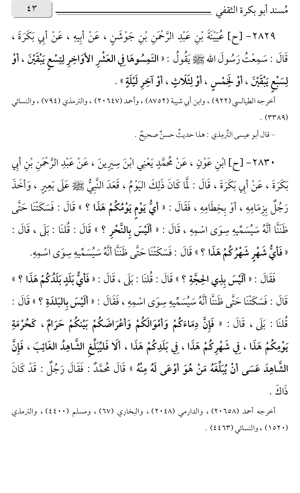 ٢٨٣٠ - [ح] ابْنِ عَوْنٍ، عَنْ مُحمَّدٍ يَعْنِي ابْنَ سِيرِينَ، عَنْ عَبْدِ الرَّحْمَنِ بْنِ أبِي بَكَرَةَ، عَنْ أبِي بَكَرَةَ، قَالَ: لمَّا كَانَ ذَلِكَ اليَوْمُ، قَعَدَ النَّبِيُّ صلى الله عليه وسلم عَلَى بَعِيرٍ، وَأخَذَ رَجُلٌ بِزِمَامِهِ، أوْ بِخِطَامِهِ، فَقَالَ: «أيُّ يَوْمٍ يَوْمُكُمْ هَذَا؟ » قَالَ: فَسَكَتْنَا حَتَّى ظَنَنَّا أنَّهُ سَيُسَمِّيهِ سِوَى اسْمِهِ، قَالَ: «ألَيْسَ بِالنَّحْرِ؟ » قَالَ: قُلنَا: بَلَى، قَالَ: «فَأيُّ شَهْرٍ شَهْرُكُمْ هَذَا؟ » قَالَ: فَسَكَتْنَا حَتَّى ظَنَنَّا أنَّهُ سَيُسَمِّيهِ سِوَى اسْمِهِ. فَقَالَ: «ألَيْسَ بِذِي الحِجَّةِ؟ » قَالَ: قُلنَا: بَلَى، قَالَ: «فَأيُّ بَلَدٍ بَلَدُكُمْ هَذَا؟ » قَالَ: فَسَكَتْنَا حَتَّى ظَننَّا أنَّهُ سَيُسَمِّيهِ سِوَى اسْمِهِ، فَقَالَ: «ألَيْسَ بِالبَلدَةِ؟ » قَالَ: قُلنَا: بَلَى، قَالَ: «فَإِنَّ دِمَاءَكُمْ وَأمْوَالَكُمْ وَأعْرَاضَكُمْ بَيْنكُمْ حَرَامٌ، كَحُرْمَةِ يَوْمِكُمْ هَذَا، فِي شَهْرِكُمْ هَذَا، فِي بَلَدِكُمْ هَذَا، ألَا فَليُبَلِّغِ الشَّاهِدُ الغَائِبَ، فَإِنَّ الشَّاهِدَ عَسَى أنْ يُبَلِّغَهُ مَنْ هُوَ أوْعَى لَهُ مِنْهُ» قَالَ مُحمَّدٌ: فَقَالَ رَجُلٌ: قَدْ كَانَ ذَاكَ.
