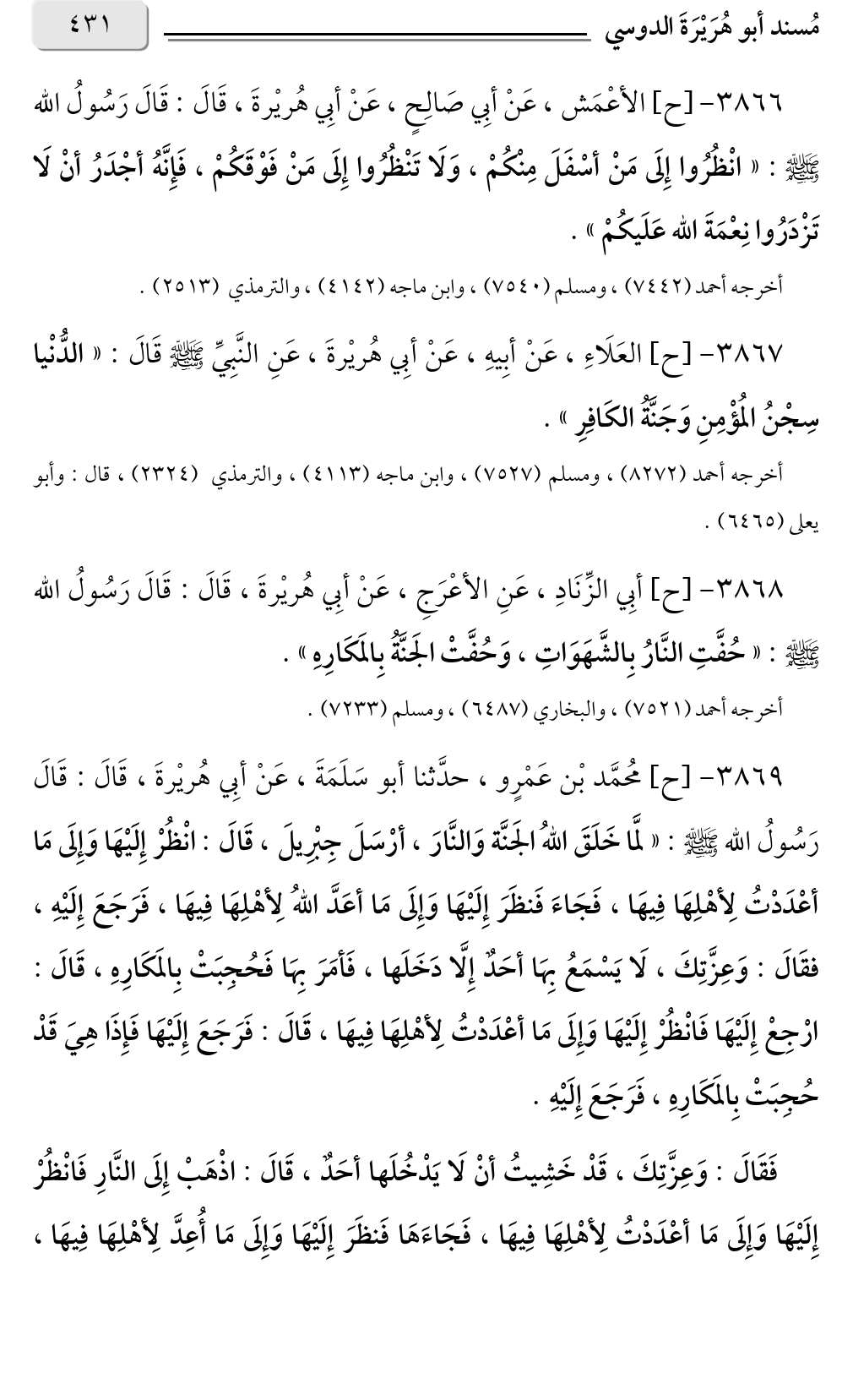 ٣٨٦٨ - [ح] أبِي الزِّنَادِ، عَنِ الأعْرَجِ، عَنْ أبِي هُريْرةَ، قَالَ: قَالَ رَسُولُ الله صلى الله عليه وسلم: «حُفَّتِ النَّارُ بِالشَّهَوَاتِ، وَحُفَّتْ الجَنَّةُ بِالمَكَارِهِ».
