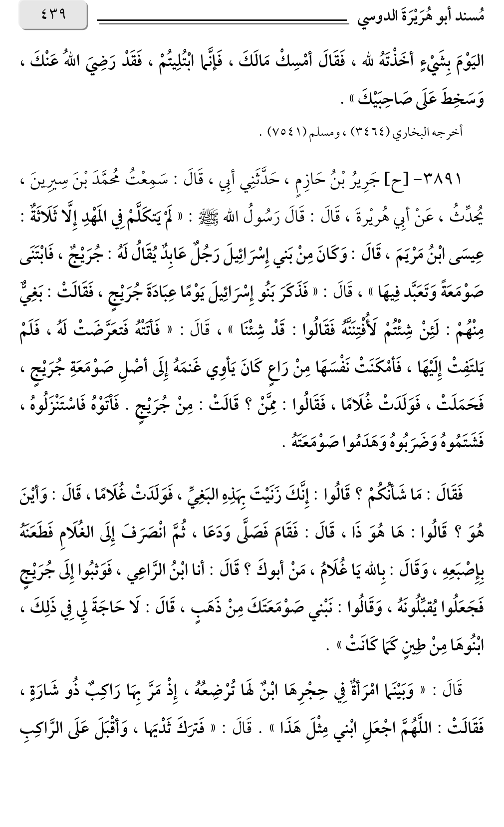 ٣٨٩١ - [ح] جَرِيرُ بْنُ حَازِمٍ، حَدَّثَنِي أبِي، قَالَ: سَمِعْتُ مُحمَّدَ بْنَ سِيرِينَ، يُحدِّثُ، عَنْ أبِي هُريْرةَ، قَالَ: قَالَ رَسُولُ الله صلى الله عليه وسلم: «لَمْ يَتكَلَّمْ فِي المَهْدِ إِلَّا ثَلَاثَةٌ: عِيسَى ابْنُ مَرْيَمَ، قَالَ: وَكَانَ مِنْ بَني إِسْرَائِيلَ رَجُلٌ عَابِدٌ يُقَالُ لَهُ: جُرَيْجٌ، فَابْتَنَى صَوْمَعَةً وَتَعَبَّد فِيهَا»، قَالَ: «فَذَكَرَ بَنُو إِسْرَائِيلَ يَوْمًا عِبَادَةَ جُرَيْجٍ، فَقَالَتْ: بَغِيٌّ مِنْهُمْ: لَئِنْ شِئْتُمْ لَأُفْتِنَنَّهُ فَقَالُوا: قَدْ شِئْنَا» قَالَ: «فَأتَتْهُ فَتعَرَّضَتْ لَهُ، فَلَمْ يَلتَفِتْ إِلَيْهَا، فَأمْكَنَتْ نَفْسَهَا مِنْ رَاعٍ كَانَ يَأوِي غَنمَهُ إِلَى أصْلِ صَوْمَعَةِ جُرَيْجٍ، فَحَمَلَتْ، فَوَلَدَتْ غُلَامًا، فَقَالُوا: مِمَّنْ؟ قَالَتْ: مِنْ جُرَيْجٍ. فَأتَوْهُ فَاسْتَنْزَلُوهُ، فَشَتَمُوهُ وَضَرَبُوهُ وَهَدَمُوا صَوْمَعَتَهُ.