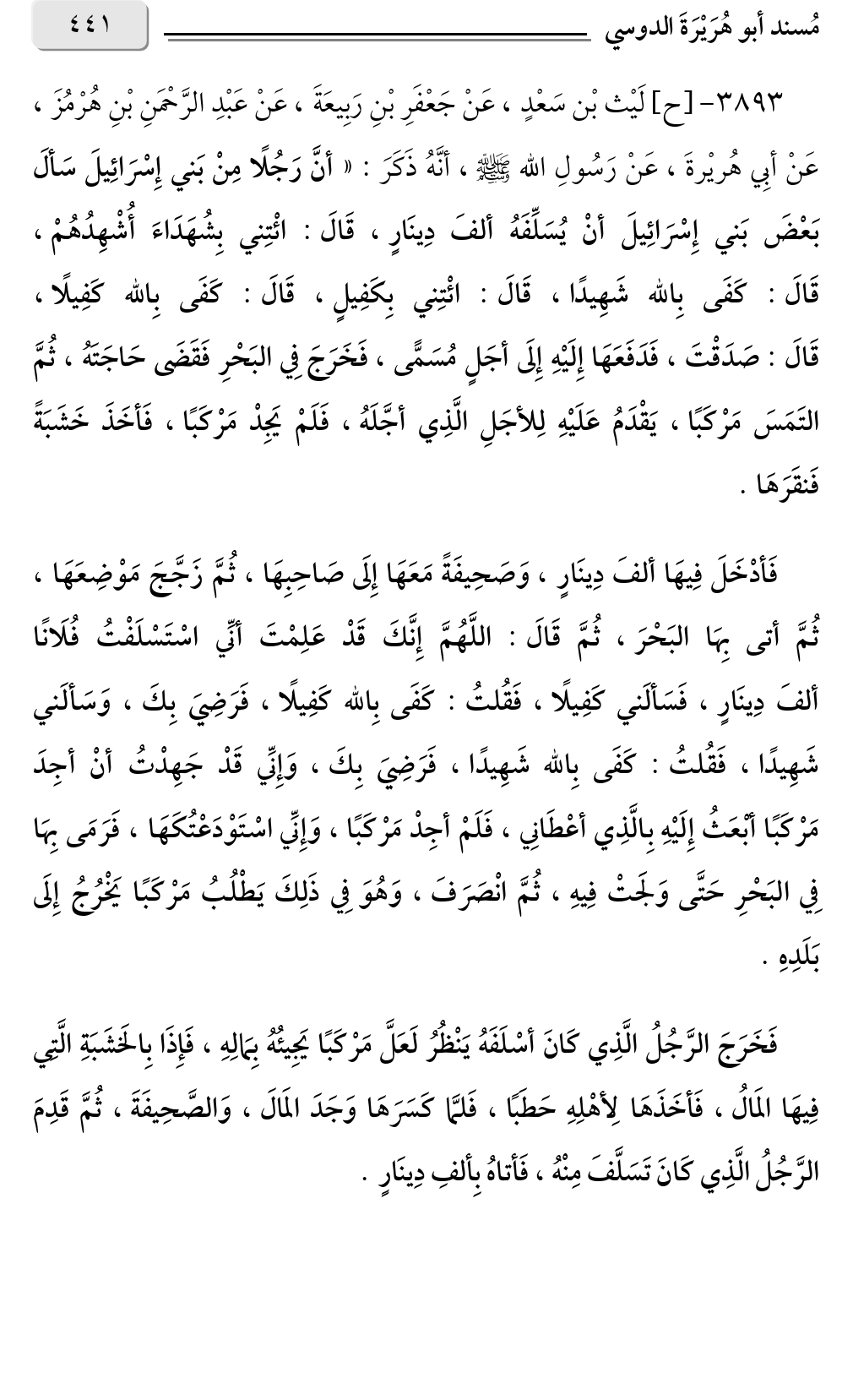 ٣٨٩٣ - [ح] لَيْث بْن سَعْدٍ، عَنْ جَعْفَرِ بْنِ رَبِيعَةَ، عَنْ عَبْدِ الرَّحْمَنِ بْنِ هُرْمُزَ، عَنْ أبِي هُريْرةَ، عَنْ رَسُولِ الله صلى الله عليه وسلم، أنَّهُ ذَكَرَ: «أنَّ رَجُلًا مِنْ بَني إِسْرَائِيلَ سَألَ بَعْضَ بَني إِسْرَائِيلَ أنْ يُسَلِّفَهُ ألفَ دِينَارٍ، قَالَ: ائْتِني بِشُهَدَاءَ أُشْهِدُهُمْ، قَالَ: كَفَى بِالله شَهِيدًا، قَالَ: ائْتِني بِكَفِيلٍ، قَالَ: كَفَى بِالله كَفِيلًا، مى، فَخَرَجَ فِي البَحْرِ فَقَضَى حَاجَتَهُ، ثُمَّ .. قَالَ: صَدَقْتَ، فَدَفَعَهَا إِلَيْهِ إِلَى أجَلٍ مُسَ التَمَسَ مَرْكَبًا، يَقْدَمُ عَلَيْهِ لِلأجَلِ الَّذِي أجَّلَهُ، فَلَمْ يَجِدْ مَرْكَبًا، فَأخَذَ خَشَبَةً فَنقَرَهَا.