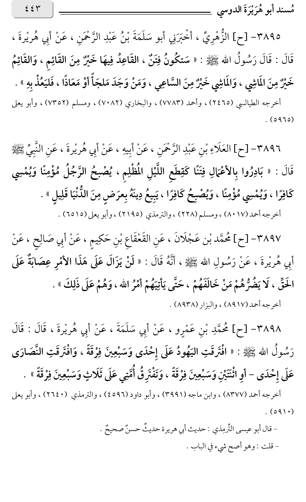 - قال أبو عيسى التِّرمِذي: حديث أبي هريرة حديثٌ حسنٌ صحيحٌ.