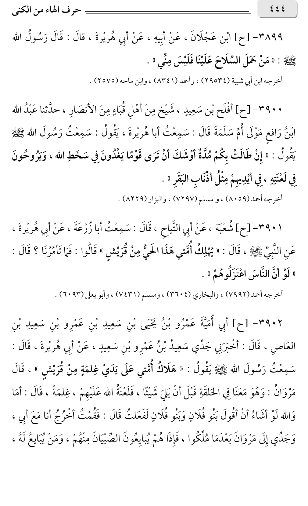 ٣٨٩٩ - [ح] ابْن عَجْلَانَ، عَنْ أبِيهِ، عَنْ أبِي هُريْرةَ، قالَ: قَالَ رَسُولُ الله صلى الله عليه وسلم: «مَنْ حَمَلَ السِّلَاحَ عَلَيْنَا فَلَيْسَ مِنِّي».