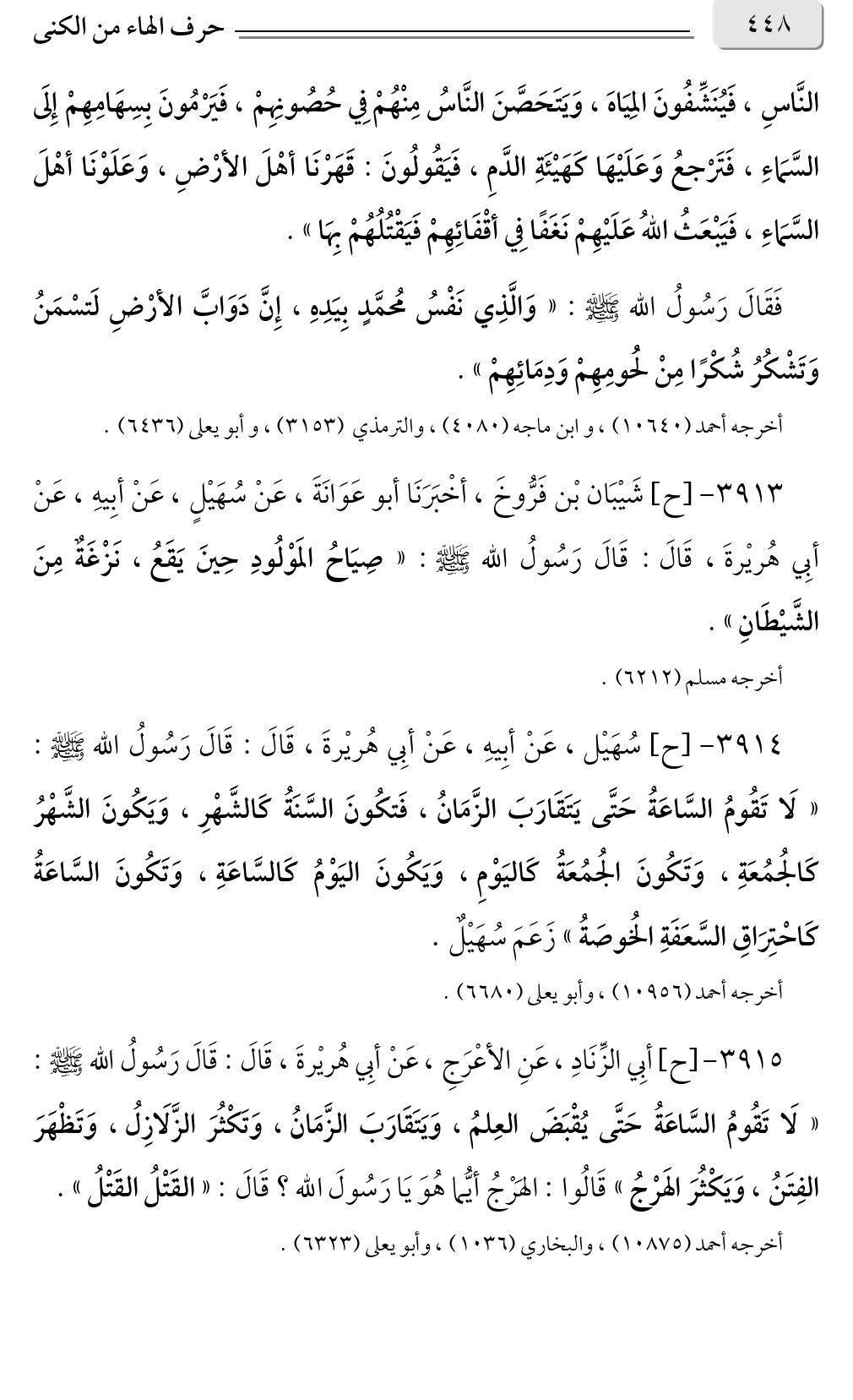 ٣٩١٥ - [ح] أبِي الزِّنَادِ، عَنِ الأعْرَجِ، عَنْ أبِي هُريْرةَ، قَالَ: قَالَ رَسُولُ الله صلى الله عليه وسلم: «لَا تَقُومُ السَّاعَةُ حَتَّى يُقْبَضَ العِلمُ، وَيَتَقَارَبَ الزَّمَانُ، وَتَكْثُرَ الزَّلَازِلُ، وَتَظْهَرَ الفِتَنُ، وَيَكْثُرَ الَهرْجُ» قَالُوا: الهَرْجُ أيُّما هُوَ يَا رَسُولَ الله؟ قَالَ: «القَتْلُ القَتْلُ».