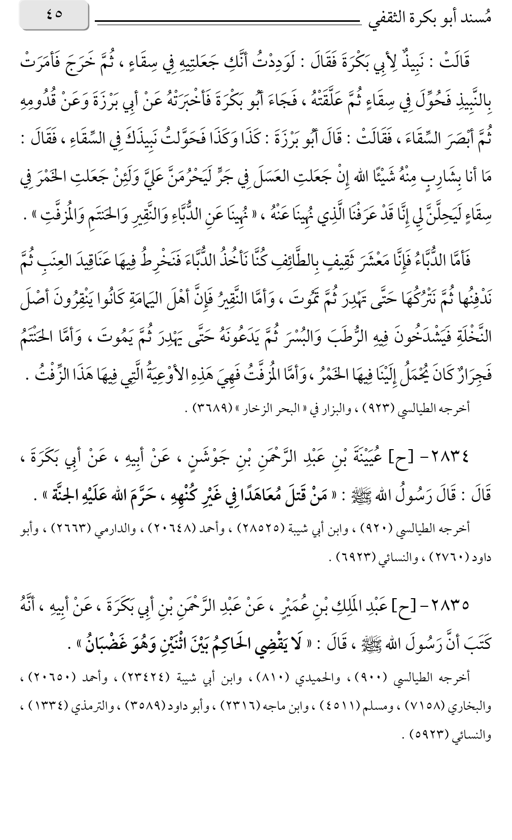 أخرجه الطيالسي (٩٢٠)، وابن أبي شيبة (٢٨٥٢٥)، وأحمد (٢٠٦٤٨)، والدارمي (٢٦٦٣)، وأبو داود (٢٧٦٠)، والنسائي (٦٩٢٣).