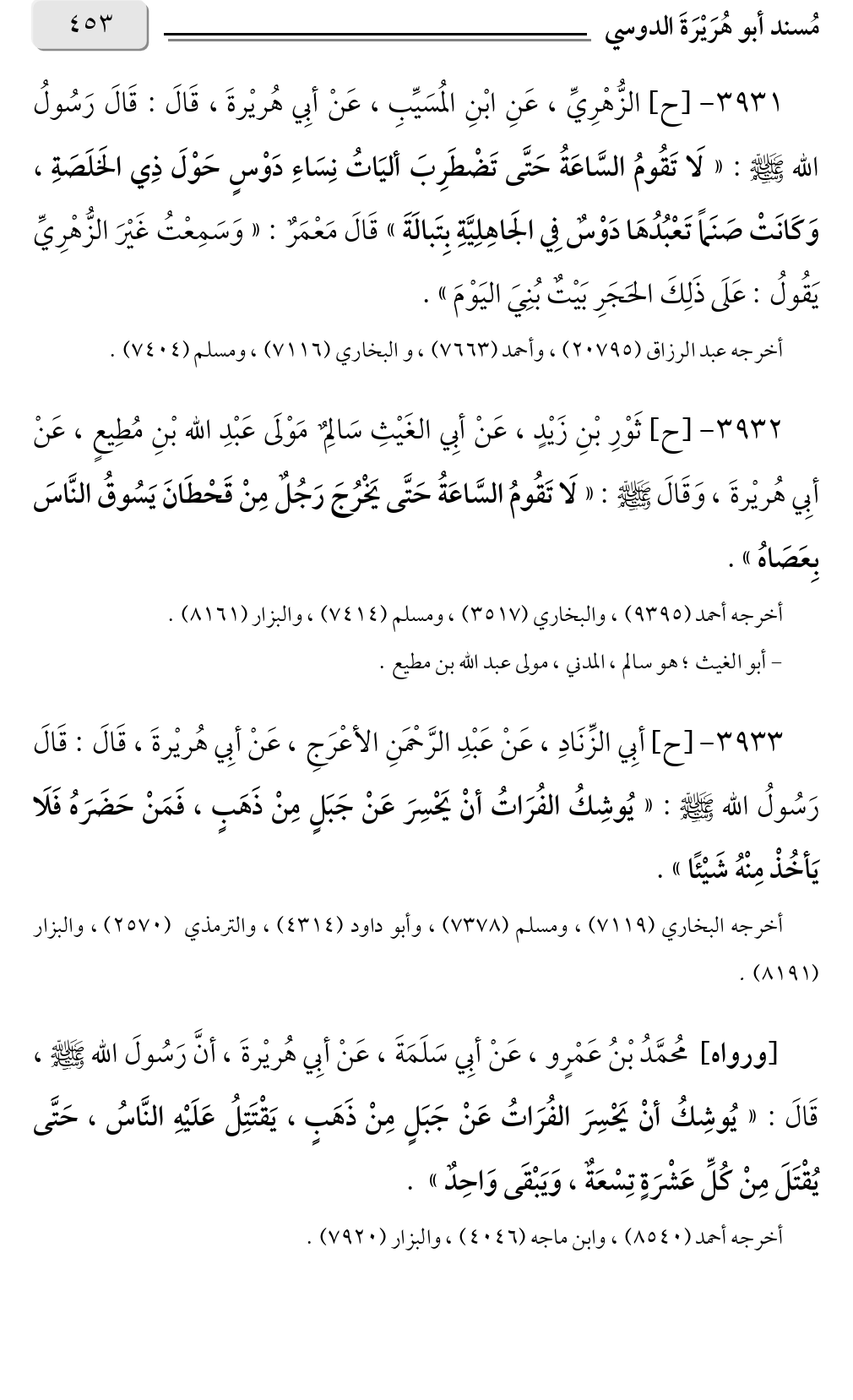٣٩٣١ - [ح] الزُّهْرِيِّ، عَنِ ابْنِ المُسَيِّبِ، عَنْ أبِي هُريْرةَ، قَالَ: قَالَ رَسُولُ الله صلى الله عليه وسلم: «لَا تَقُومُ السَّاعَةُ حَتَّى تَضْطَرِبَ أليَاتُ نِسَاءِ دَوْسٍ حَوْلَ ذِي الخَلَصَةِ، وَكَانَتْ صَنَمًا تَعْبُدُهَا دَوْسٌ فِي الجَاهِلِيَّةِ بِتَبالَةَ» قَالَ مَعْمَرٌ: «وَسَمِعْتُ غَيْرَ الزُّهْرِيِّ يَقُولُ: عَلَى ذَلِكَ الحَجَرِ بَيْتٌ بُنِيَ اليَوْمَ».