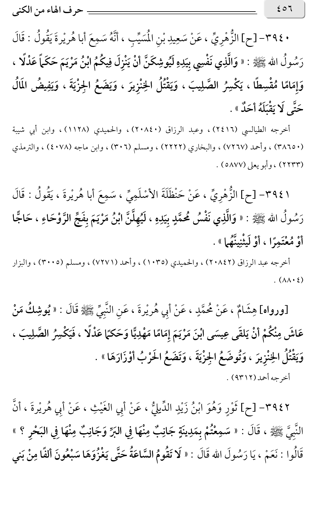 ٣٩٤٠ - [ح] الزُّهْرِيِّ، عَنْ سَعِيدِ بْنِ المُسَيِّبِ، أنَّهُ سَمِعَ أبا هُريْرةَ يَقُولُ: قَالَ رَسُولُ الله صلى الله عليه وسلم: «وَالَّذِي نَفْسِي بِيَدِهِ لَيُوشِكَنَّ أنْ يَنْزِلَ فِيكُمُ ابْنُ مَرْيَمَ حَكَمًا عَدْلًا، وَإِمَامًا مُقْسِطًا، يَكْسِرُ الصَّلِيبَ، وَيَقْتُلُ الخِنْزِيرَ، وَيَضَعُ الجِزْيَةَ، وَيَفِيضُ المَالُ حَتَّى لَا يَقْبَلَهُ أحَدٌ».