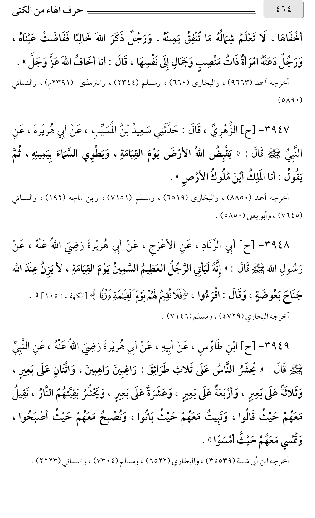 ٣٩٤٧ - [ح] الزُّهْرِيِّ، قَالَ: حَدَّثَنِي سَعِيدُ بْنُ المُسَيِّبِ، عَنْ أبِي هُريْرةَ، عَنِ النَّبِيِّ صلى الله عليه وسلم قَالَ: «يَقْبِضُ اللهُ الأرْضَ يَوْمَ القِيَامَةِ، وَيَطْوِي السَّمَاءَ بِيَمِينِهِ، ثُمَّ يَقُولُ: أنا المَلِكُ أيْنَ مُلُوكُ الأرْضِ».