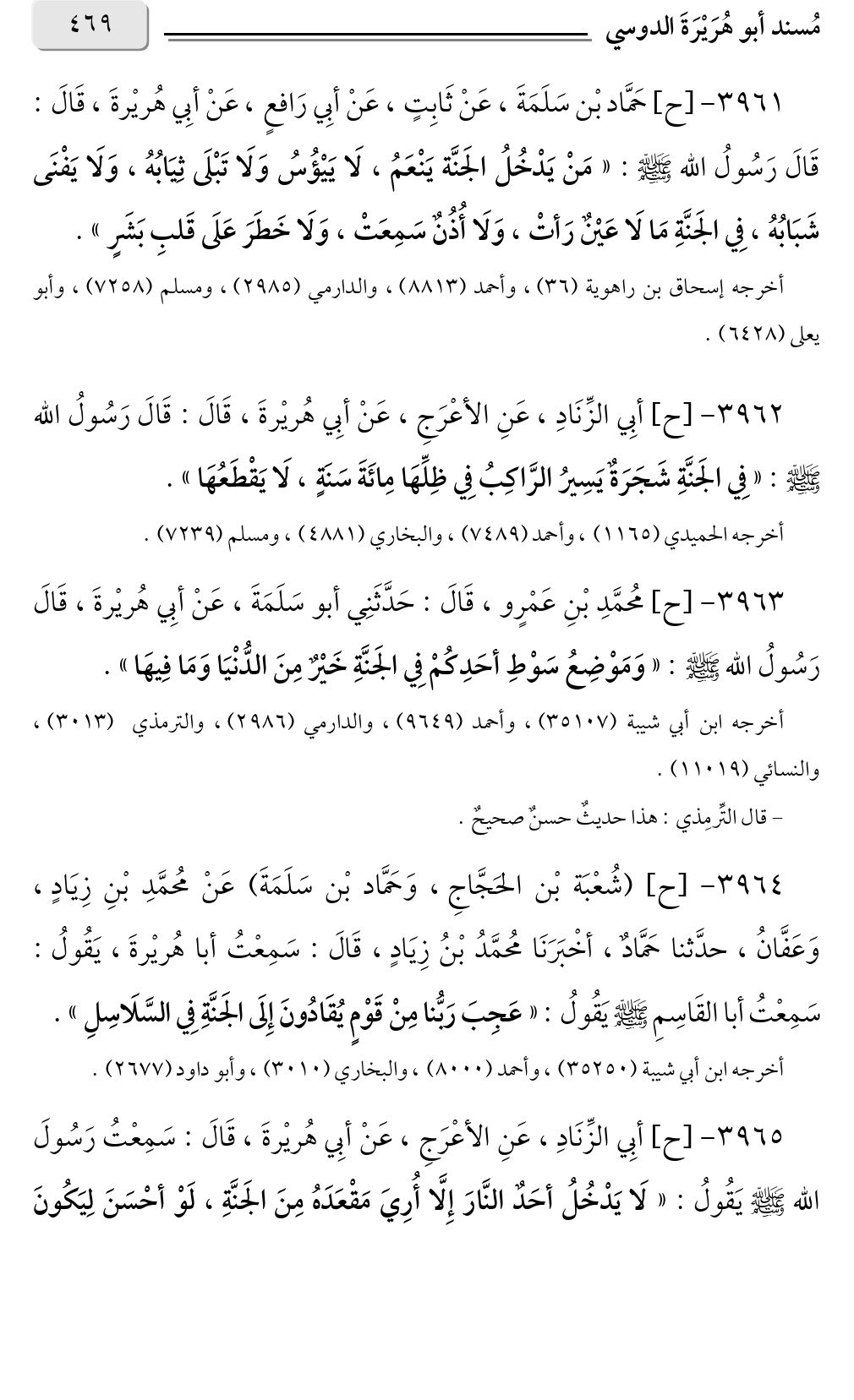 ٣٩٦١ - [ح] حَمَّاد بْن سَلَمَةَ، عَنْ ثَابِتٍ، عَنْ أبِي رَافعٍ، عَنْ أبِي هُريْرةَ، قَالَ: قَالَ رَسُولُ الله صلى الله عليه وسلم: «مَنْ يَدْخُلُ الجَنَّة يَنْعَمُ، لَا يَيْؤُسُ وَلَا تَبْلَى ثِيَابُهُ، وَلَا يَفْنَى شَبَابُهُ، فِي الجَنَّةِ مَا لَا عَيْنٌ رَأتْ، وَلَا أُذُنٌ سَمِعَتْ، وَلَا خَطَرَ عَلَى قَلبِ بَشَرٍ».