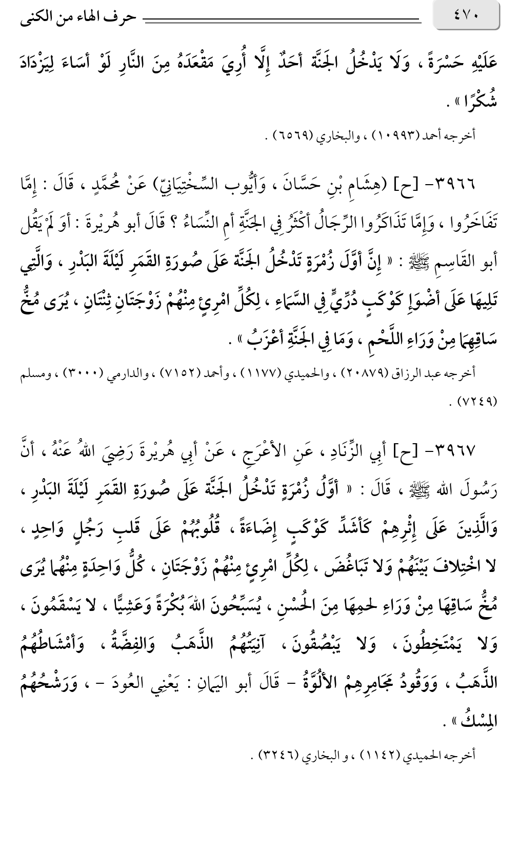 ٣٩٦٧ - [ح] أبِي الزِّنَادِ، عَنِ الأعْرَجِ، عَنْ أبِي هُريْرةَ رَضِيَ اللهُ عَنْهُ، أنَّ رَسُولَ الله صلى الله عليه وسلم، قَالَ: «أوَّلُ زُمْرَةٍ تَدْخُلُ الجَنَّة عَلَى صُورَةِ القَمَرِ لَيْلَةَ البَدْرِ، وَالَّذِينَ عَلَى إِثْرِهِمْ كَأشَدِّ كَوْكَبٍ إِضَاءَةً، قُلُوبُهُمْ عَلَى قَلبِ رَجُلٍ وَاحِدٍ، لا اخْتِلافَ بَيْنَهُمْ وَلا تَبَاغُضَ، لِكُلِّ امْرِئٍ مِنْهُمْ زَوْجَتَانِ، كُلُّ وَاحِدَةٍ مِنْهُما يُرَى مُخُّ سَاقِهَا مِنْ وَرَاءِ لحمِهَا مِنَ الحُسْنِ، يُسَبِّحُونَ اللهَ بُكْرَةً وَعَشِيًّا، لا يَسْقَمُونَ، وَلا يَمْتَخِطُونَ، وَلا يَبْصُقُونَ، آنِيَتُهُمُ الذَّهَبُ وَالفِضَّةُ، وَأمْشَاطُهُمُ الذَّهَبُ، وَوَقُودُ مَجَامِرِهِمْ الألُوَّةُ - قَالَ أبو اليَمانِ: يَعْنِي العُودَ -، وَرَشْحُهُمُ المِسْكُ».