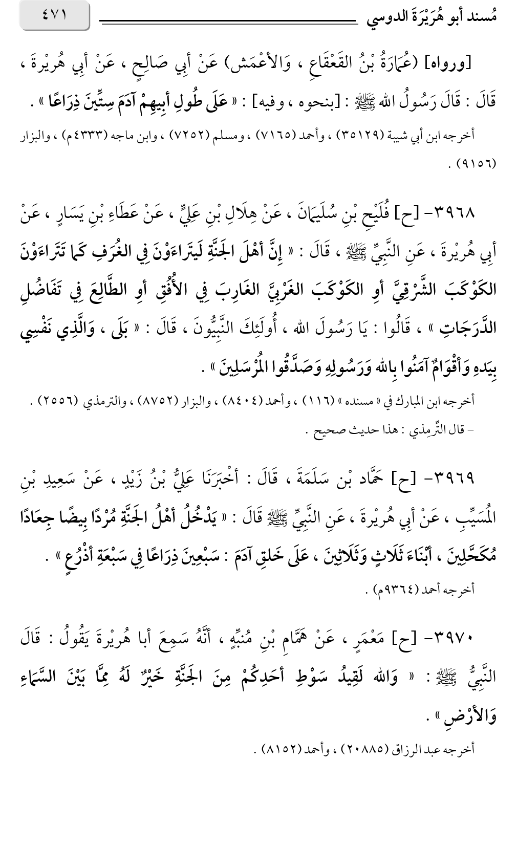 ٣٩٦٩ - [ح] حَمَّاد بْن سَلَمَةَ، قَالَ: أخْبَرَنَا عَلِيُّ بْنُ زَيْدٍ، عَنْ سَعِيدِ بْنِ المُسَيِّبِ، عَنْ أبِي هُريْرةَ، عَنِ النَّبِيِّ صلى الله عليه وسلم قَالَ: «يَدْخُلُ أهْلُ الجَنَّةِ مُرْدًا بِيضًا جِعَادًا مُكَحَّلِينَ، أبْنَاءَ ثَلَاثٍ وَثَلَاثِينَ، عَلَى خَلقِ آدَمَ: سَبْعِينَ ذِرَاعًا فِي سَبْعَةِ أذْرُعٍ».